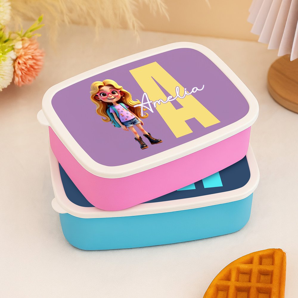 Du kan välja mellan två färger på matlådan (rosa och blå), välja färg på locket, välja ett könsspecifikt tecknad mönster från över 60 stilar och anpassa med ett namn. Det gör att du kan skapa en matlåda som är unikt anpassad till ditt barns preferenser.