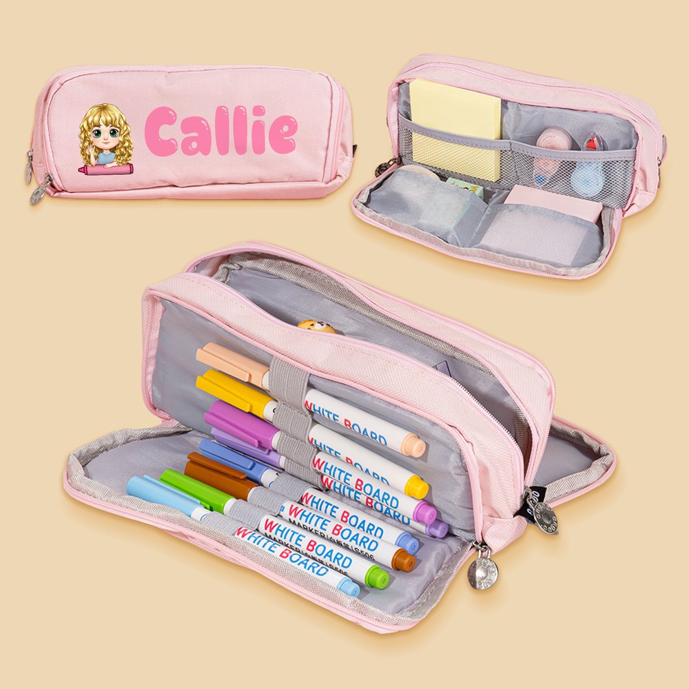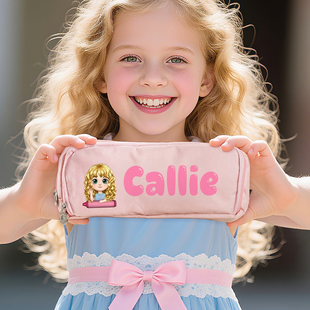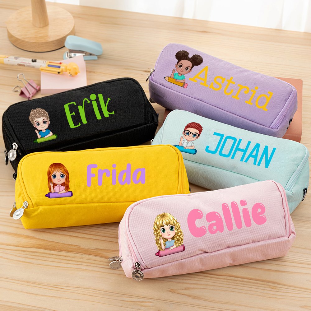 Skräddarsy pennfodralet med ditt barns namn och en söt tecknad figur – välj mellan en pojke eller flicka. Figuren har en hand som räcker upp, vilket symboliserar ett barn som studerar seriöst. En unik accessoar som speglar deras personlighet.