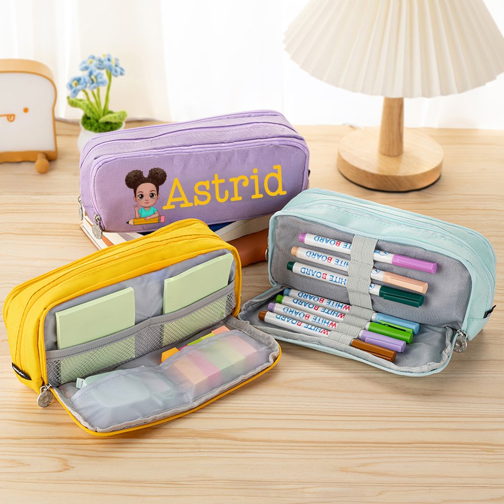 Personligt pennfodral med tre fack söt tecknad karaktär och namn skolmaterial skolstart eller födelsedagspresent för pojkar och flickor