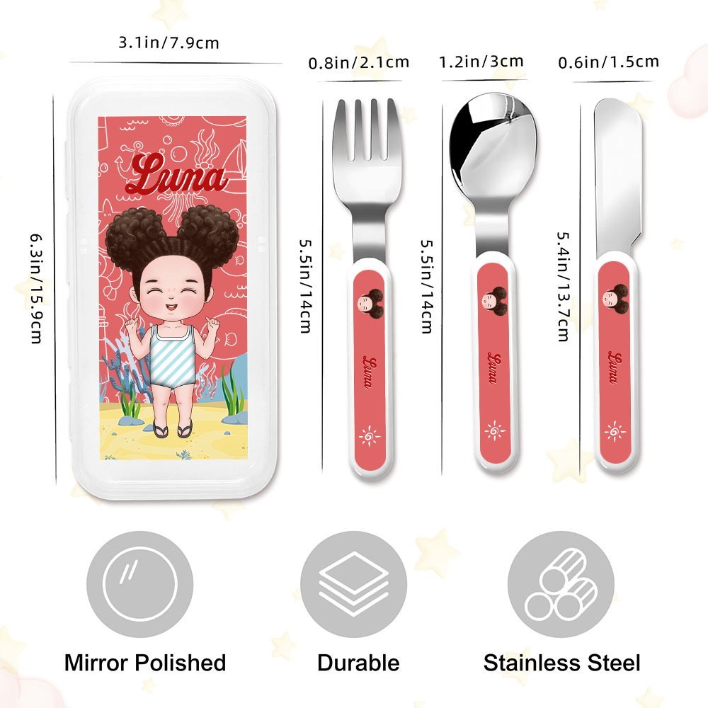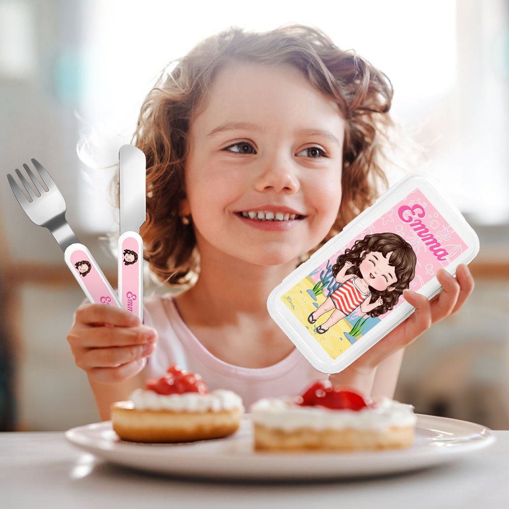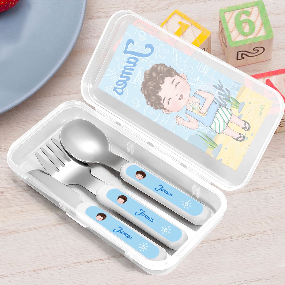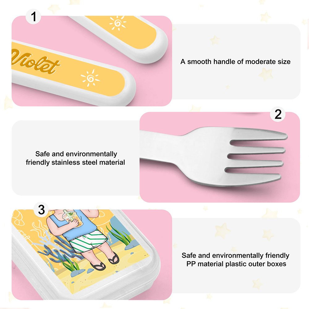 Detta set med kniv, gaffel och sked för barn har ett enkelt vitt handtag med bedårande tecknade mönster som går att anpassa. De livfulla mönstren fångar lätt barnens uppmärksamhet och gör måltiderna roligare och färggladare. Du kan göra varje del personlig med tecknade figurer och ditt barns namn, vilket gör varje redskap till en unik och speciell sak bara för dem.