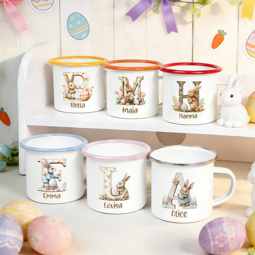 Denna kollektion har vackra påskmotiv med personliga namn. Varje mugg pryds av barnets initial tillsammans med en söt kaninillustration som trycks med hög precision. Det tryckta namnet under bokstaven gör muggen till en helt unik gåva.