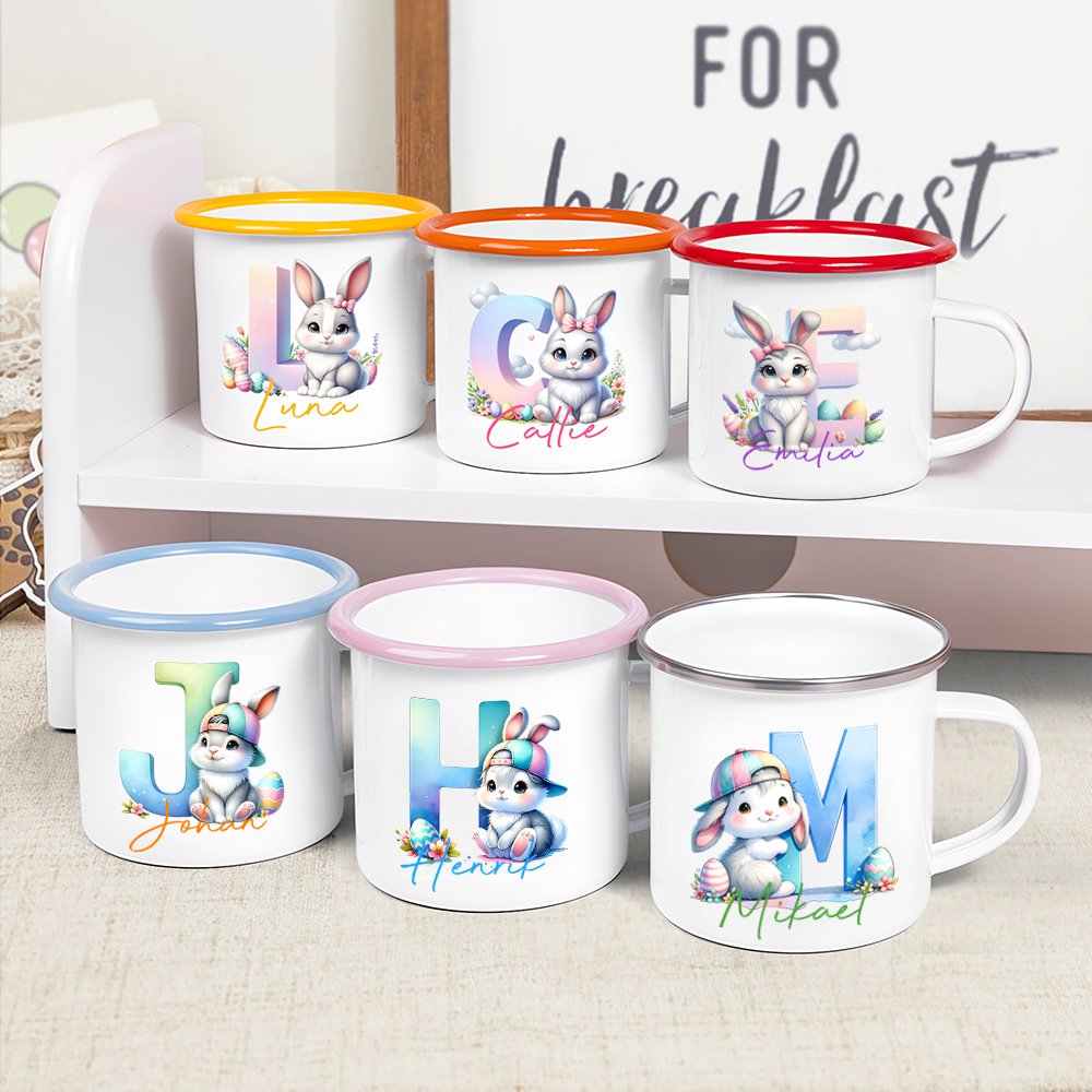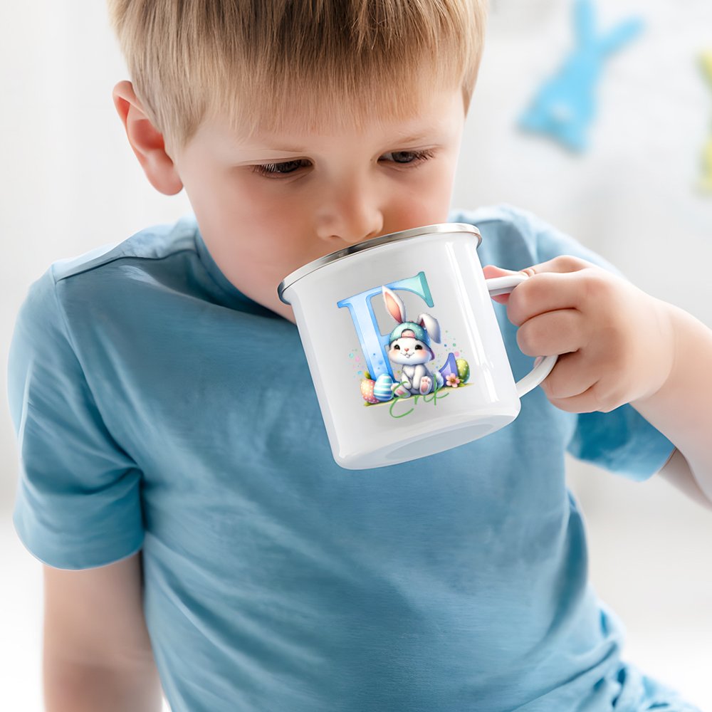 Den här charmiga emaljmuggen har ett bedårande påskhare-motiv som direkt sprider en härlig påskstämning. Genom att trycka barnets namn och initialer blir muggen helt unik – en personlig favorit som barnet kommer att älska att plocka fram, påsk efter påsk.