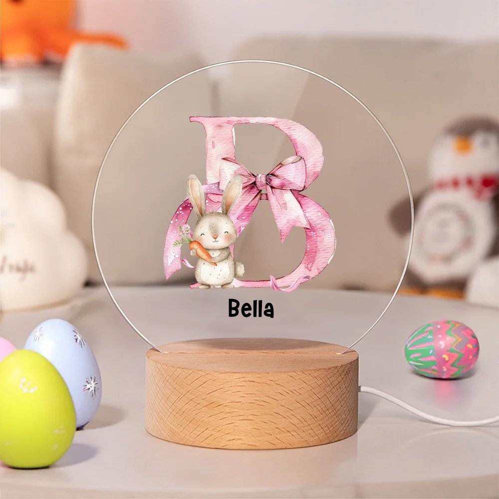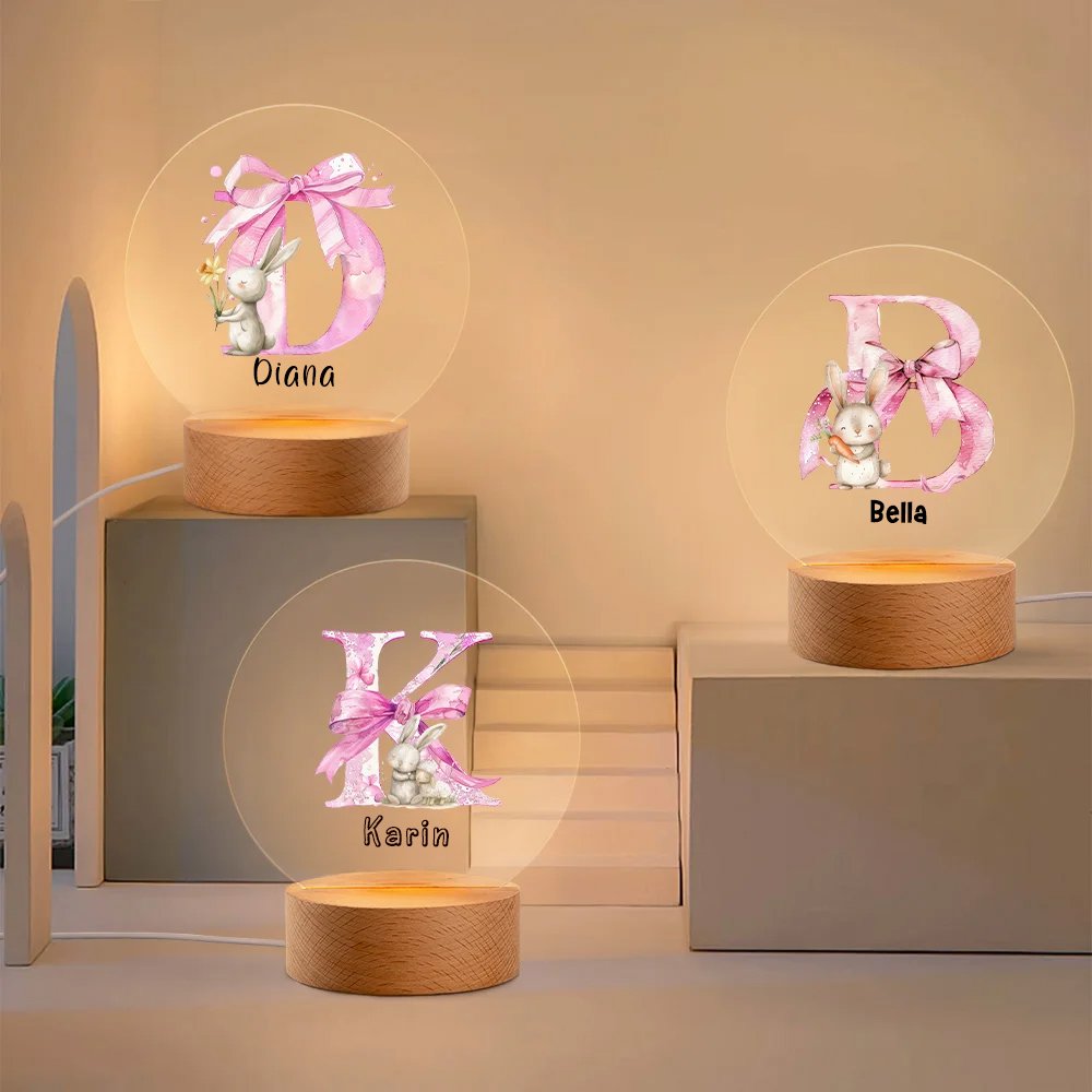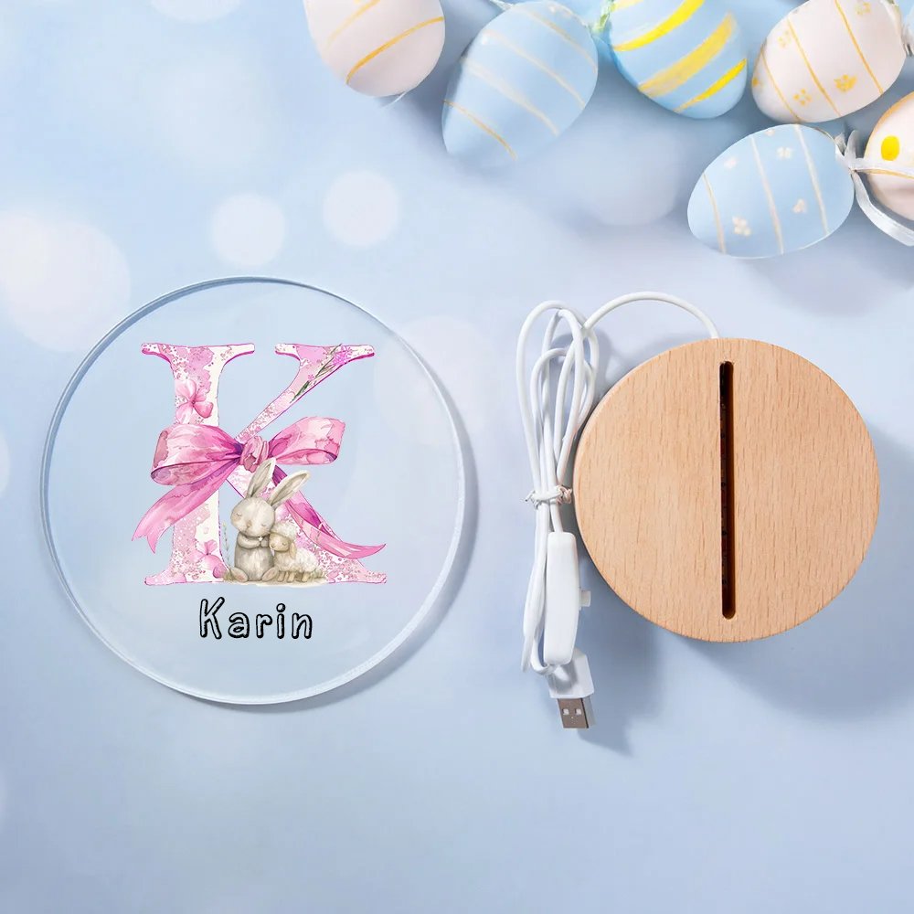 Denna nattlampa har en charmig och lekfull design som utstrålar barnslig oskuldsfullhet. Ett rosa band pryder initialerna, och en söt påskhare finns nedanför, vilket ger en festlig känsla. Lägg till namn för att göra den till en personlig och minnesvärd present för varje litet barn, vilket gör den till en perfekt nattkompis för alla åldrar.