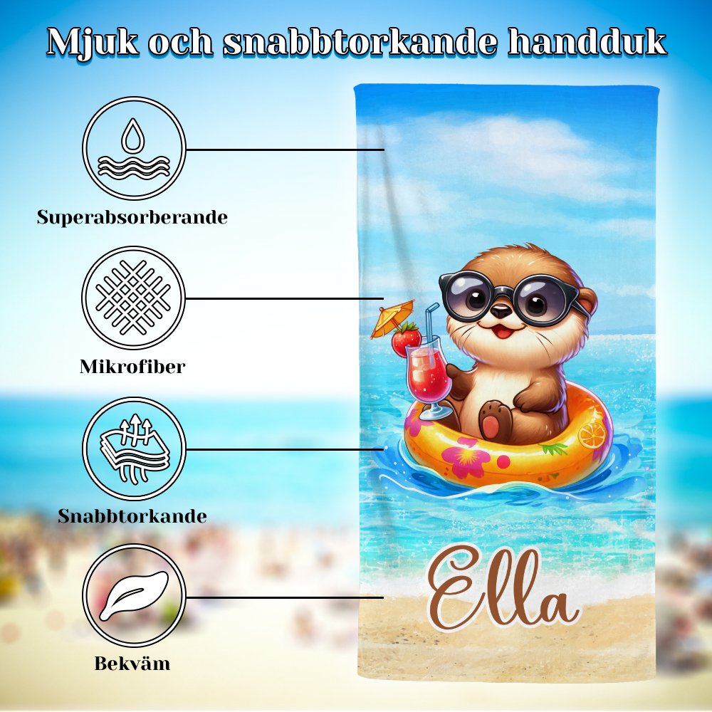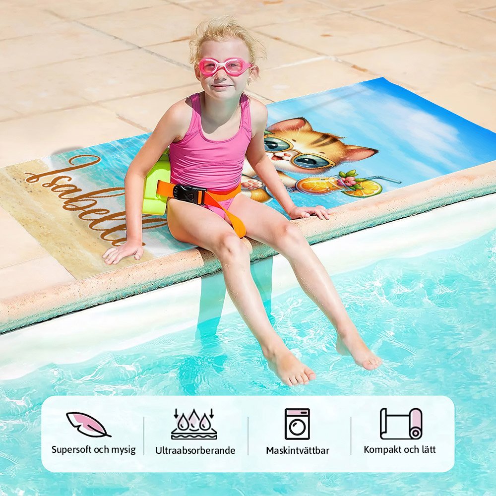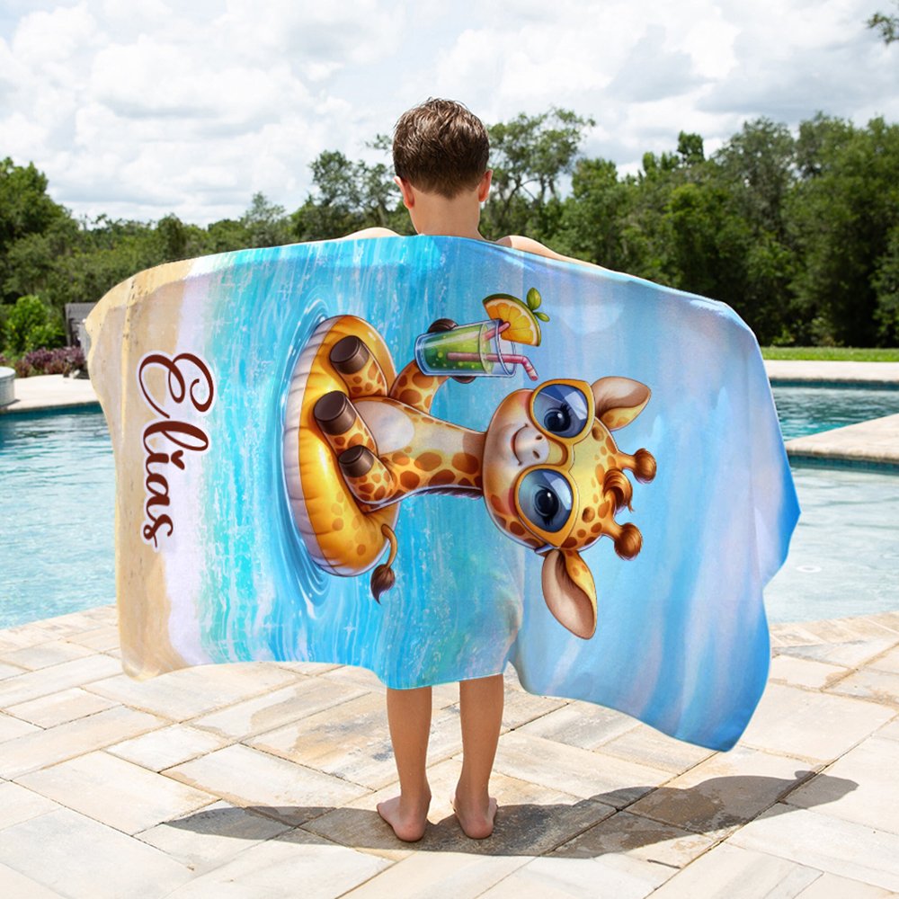 Denna strandhandduk har ett livligt och sött mönster med tecknade djur, där djuren bär solglasögon och njuter av sommaren. Vi erbjuder 26 olika djurmönster, t.ex. elefanter, giraffer, lejon, fantasi-enhörningar osv. Du kan välja efter dina preferenser. Du kan också anpassa namnet på strandhandduken, vilket gör den till en exklusiv artikel full av personlighet och kul.