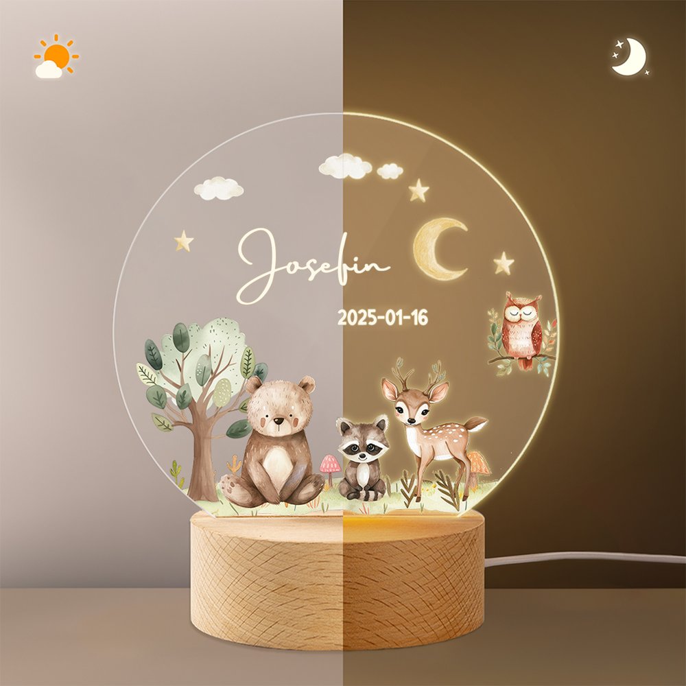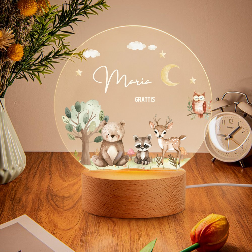 Denna nattlampa pryds av bedårande djurmotiv som en björn, en hjort, en tvättbjörn och en uggla. Omgiven av träd, moln och en måne skapar den en skogsliknande atmosfär. Anpassningsbara namn och text kan läggas till för att skapa en unik prydnad.