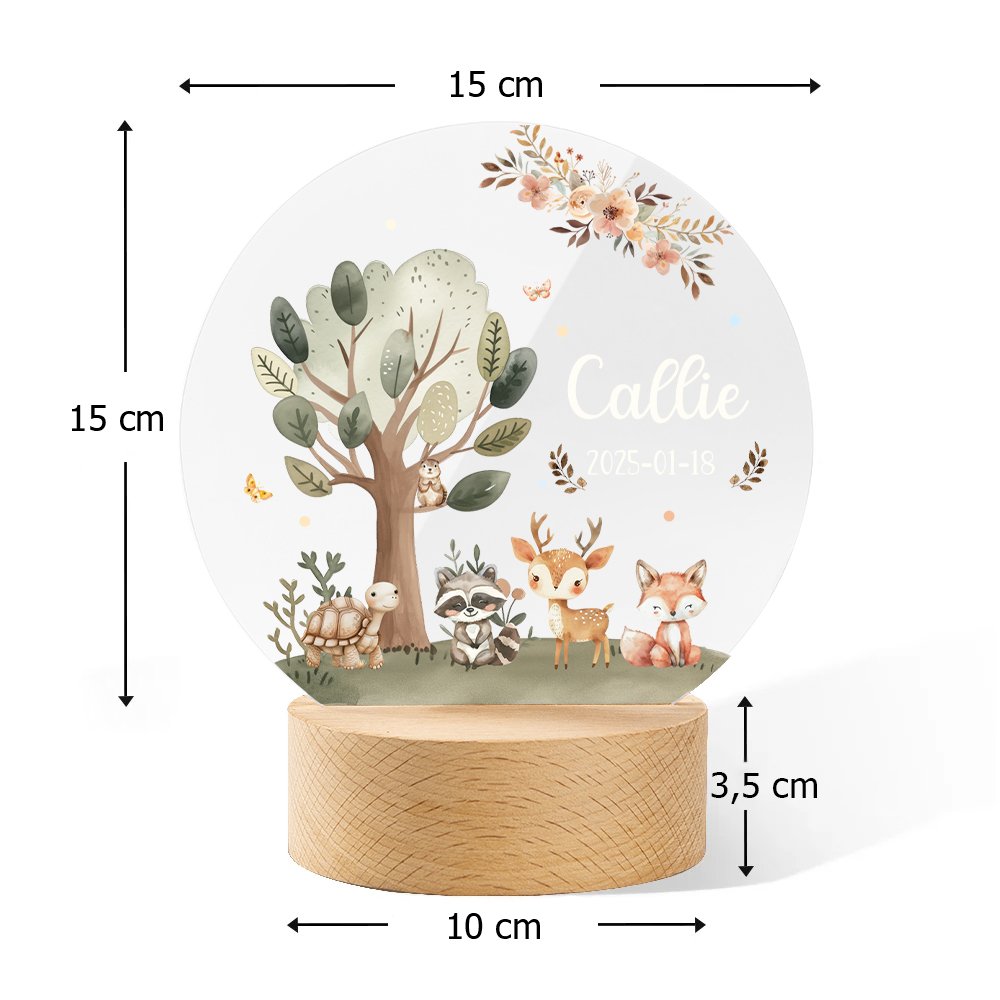 Denna nattlampa är inspirerad av de söta djuren i skogen och fyller rummet med lekfullhet och värme. Den har ett tryck med livliga träd, färgglada blommor och glada djur som rådjur, rävar och sköldpaddor – en perfekt nattkompis för barn som gillar naturen. Du kan även lägga till egen namn eller datum för att göra lampan ännu mer personlig.