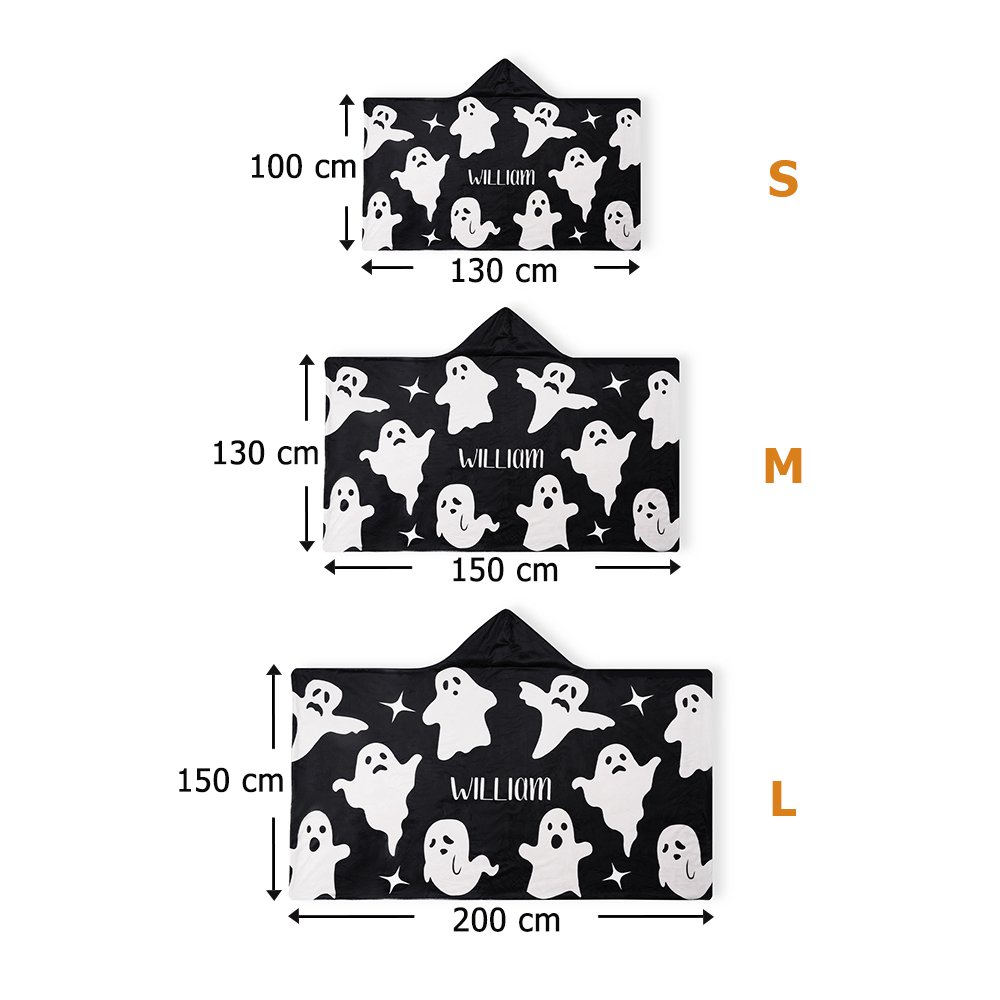 Denna huva pläd har söta spök-mönster, perfekt för Halloween. Du kan anpassa den med ett namn, vilket ger en unik touch. Designen skapar en stark känsla av skrämmande säsong och en spöklik atmosfär.