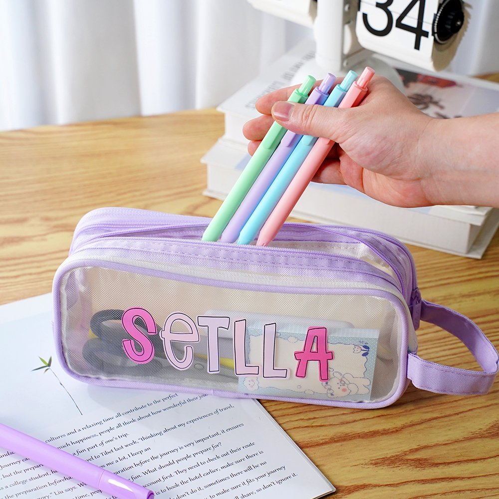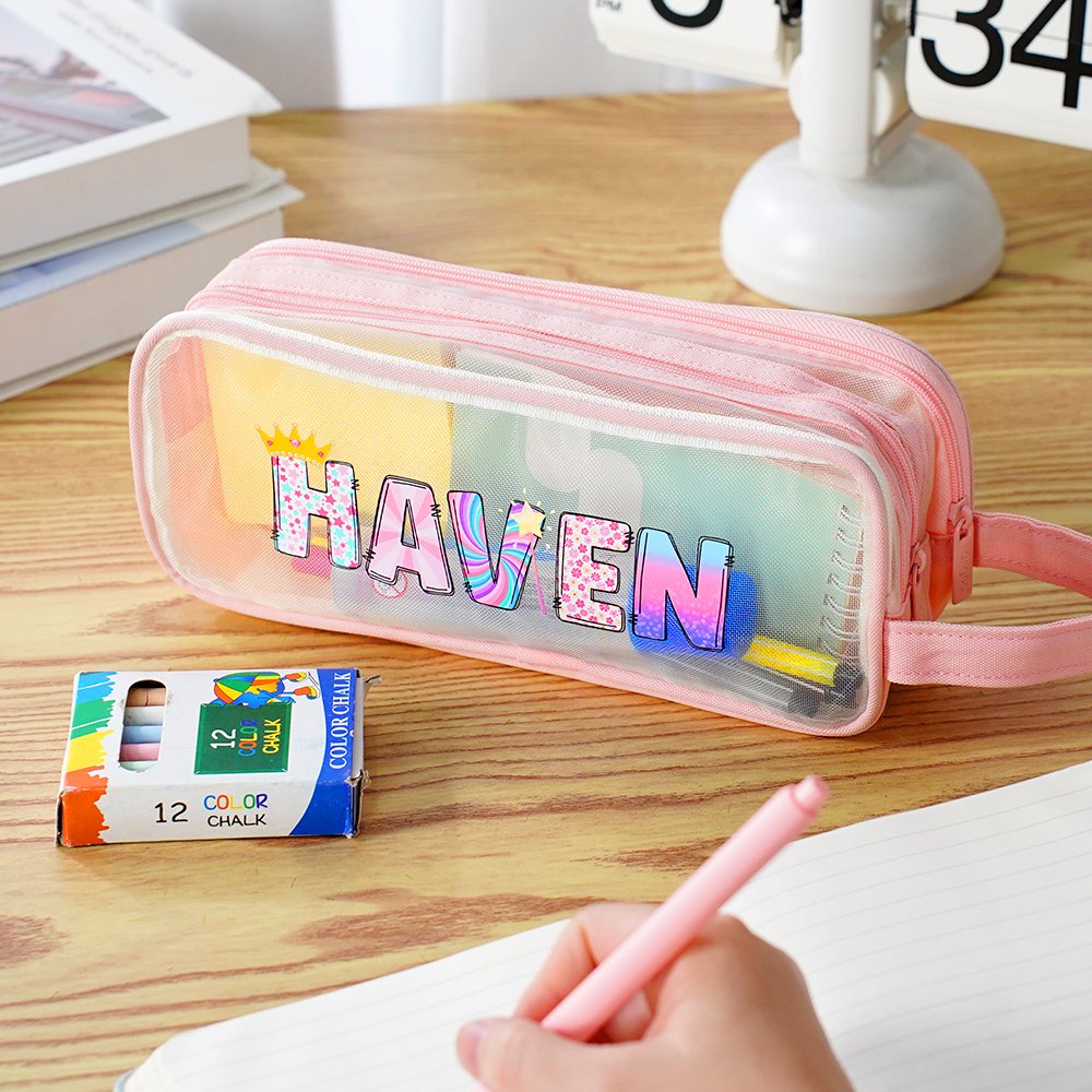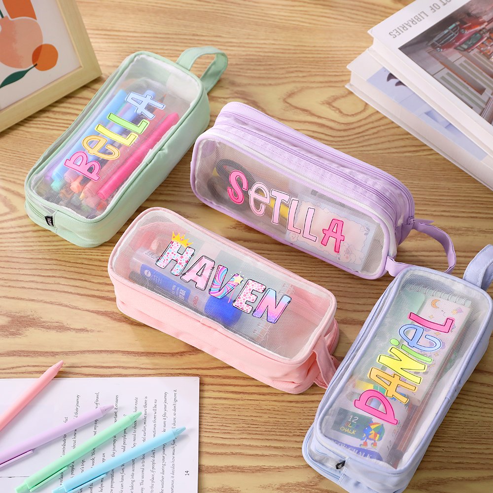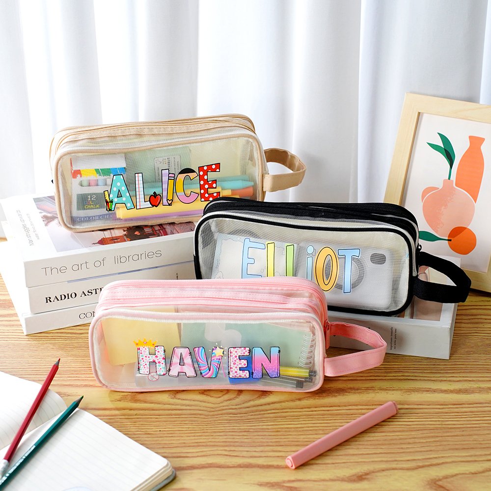 Detta genomskinliga pennfodral i mesh har en barnslig design som ger en ny upplevelse när du organiserar dina pappersvaror. Med sex valbara färger på pennfodralet och fem livfulla typsnitt kan du fritt anpassa pennfodralets stil. Dessutom kan du lägga till ditt barns namn i det och skapa en personlig skolväska åt dem.