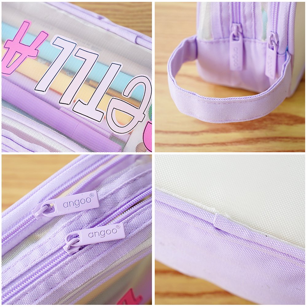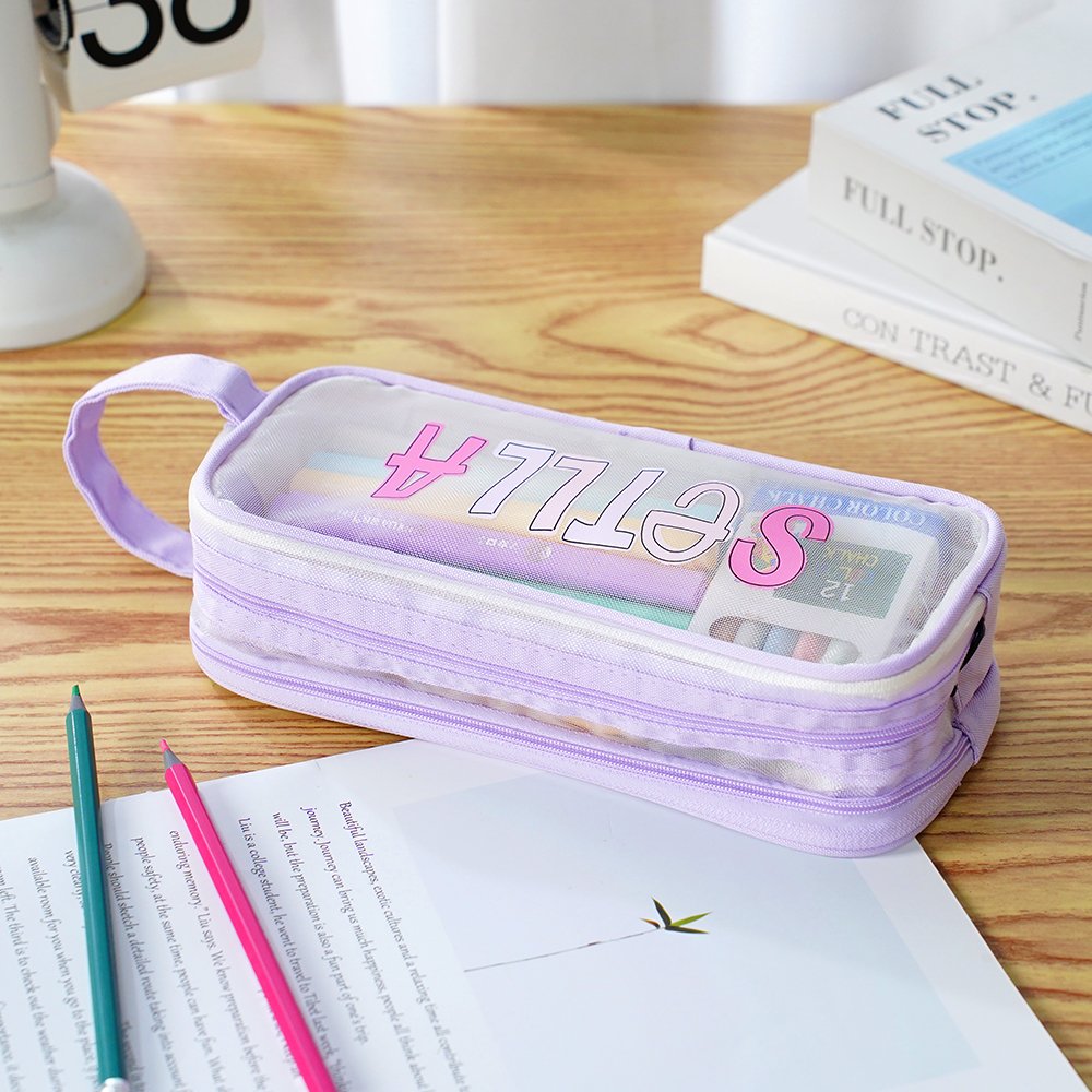 Detta pennfodral är tillverkat av högkvalitativt nätmaterial och är lätt, andas, hållbart och slitstarkt. Designen med dubbla blixtlås garanterar smidig och bekväm användning samtidigt som pennfodralets livslängd förlängs. Ett stadigt bärhandtag är också fäst på sidan, vilket gör det enkelt för barnen att bära med sig sina saker när de går ut.