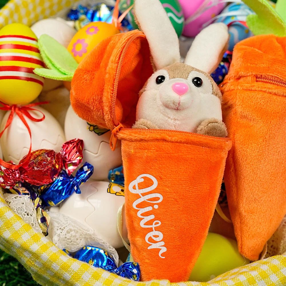 Vår mjukisdjursnyckelring har en söt kanin som gömmer sig inuti en morot. När du öppnar toppen på moroten dyker en långörad kanin upp, fylld med lekfulla överraskningar. Ytan på moroten kan också anpassas med ditt barns namn, vilket gör den personlig och unik.