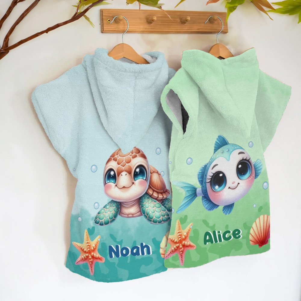 Den här charmiga strandhandduken med huva pryds av 16 underbara havsdjur – inklusive clownfiskar, tropiska fiskar, sköldpaddor, maneter och krabbor. Det lekfulla motivet är dekorerat med snäckskal, sjöstjärnor och bubblor, vilket väcker havsmiljön till liv och stimulerar fantasin under strand- eller pooläventyr. För en personlig touch kan handduken fås med barnets namn – en glad och minnesvärd följeslagare för sommarens alla äventyr.