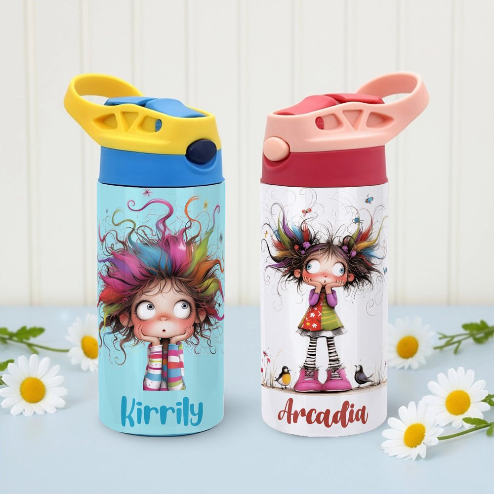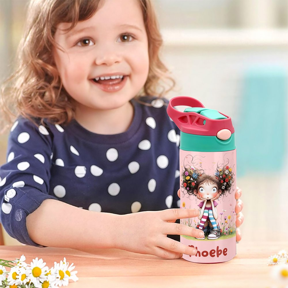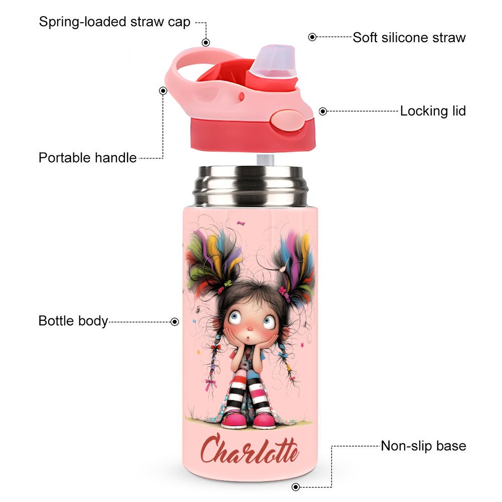 Den här isolerade vattenflaskan har en söt och lekfull tecknad bild av en flicka som sin designhöjdpunkt. Den är full av barnslighet och vitalitet och är skräddarsydd för barn. Den tecknade mönsterdesignen är färgstark, med 15 mönster och 8 koppfärger som fritt kan kombineras och matchas med barnets namn, vilket gör varje vattenkopp unik och visar personlig exklusiv charm.