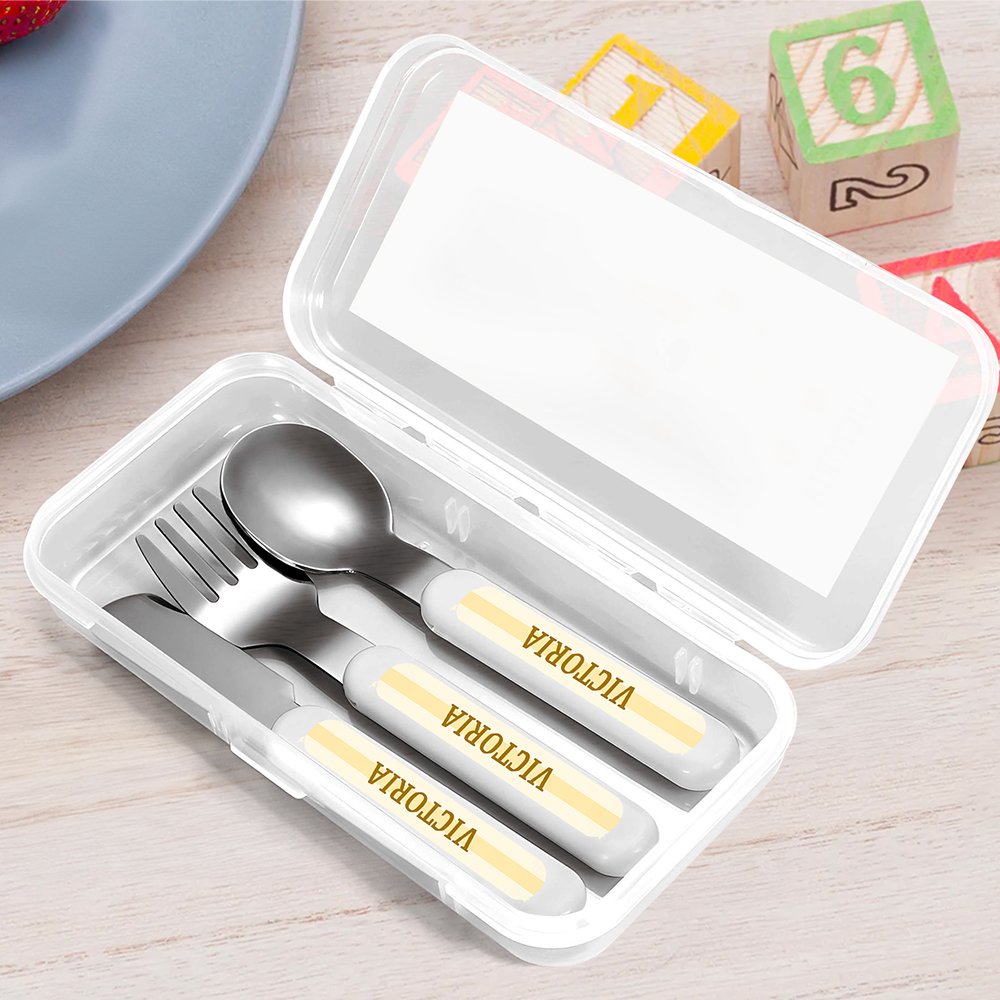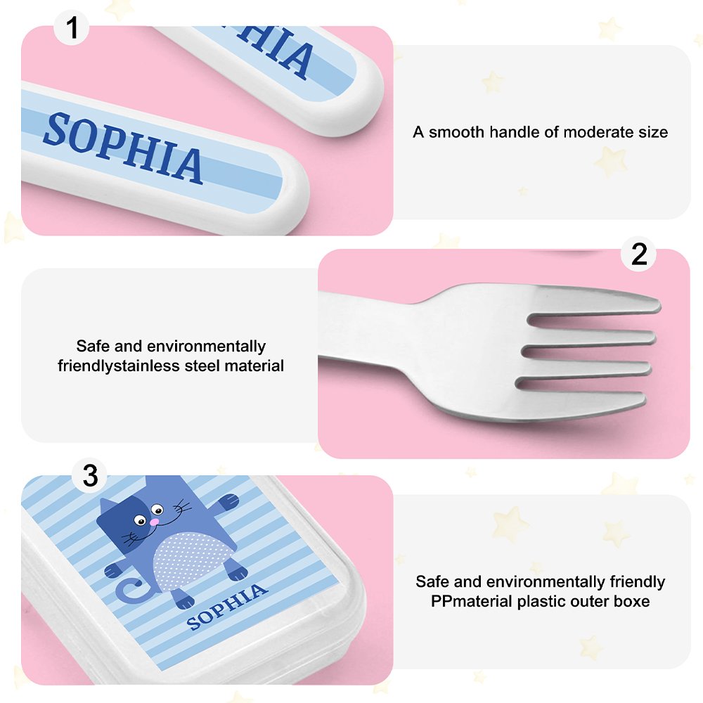 Den här barnservisen innehåller kniv, gaffel och sked. Matlådan är dekorerad med söta djurmönster, t.ex. söta valpar och stygga apor. Den är designad för barn för att göra varje måltid rolig. Samtidigt kan du också anpassa ditt barns namn för att göra det till ett unikt och exklusivt porslin, förbättra känslan av tillhörighet och låta ditt barn bli kär i självständigt ätande.