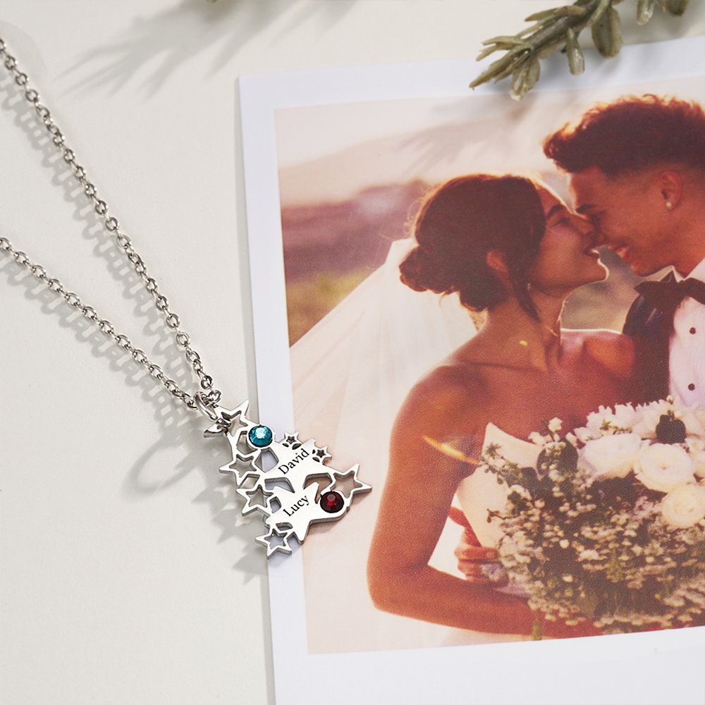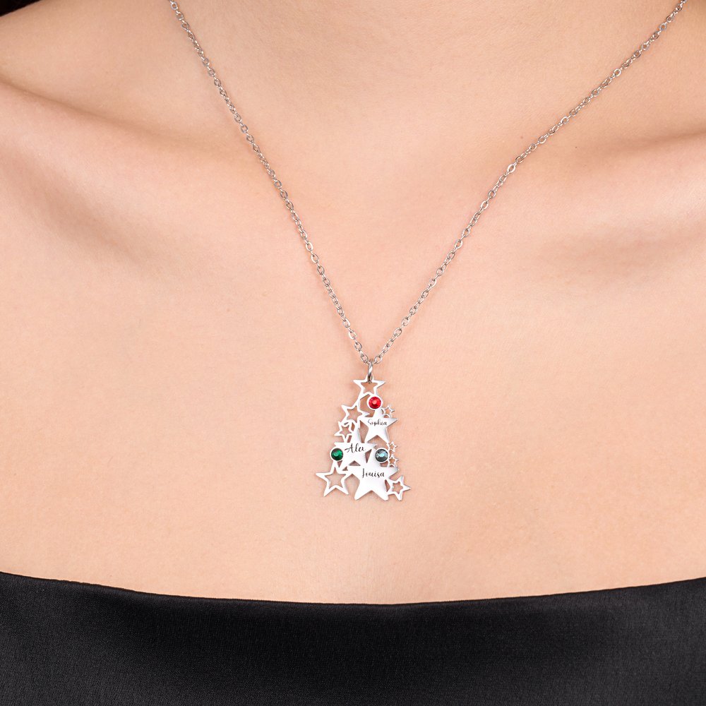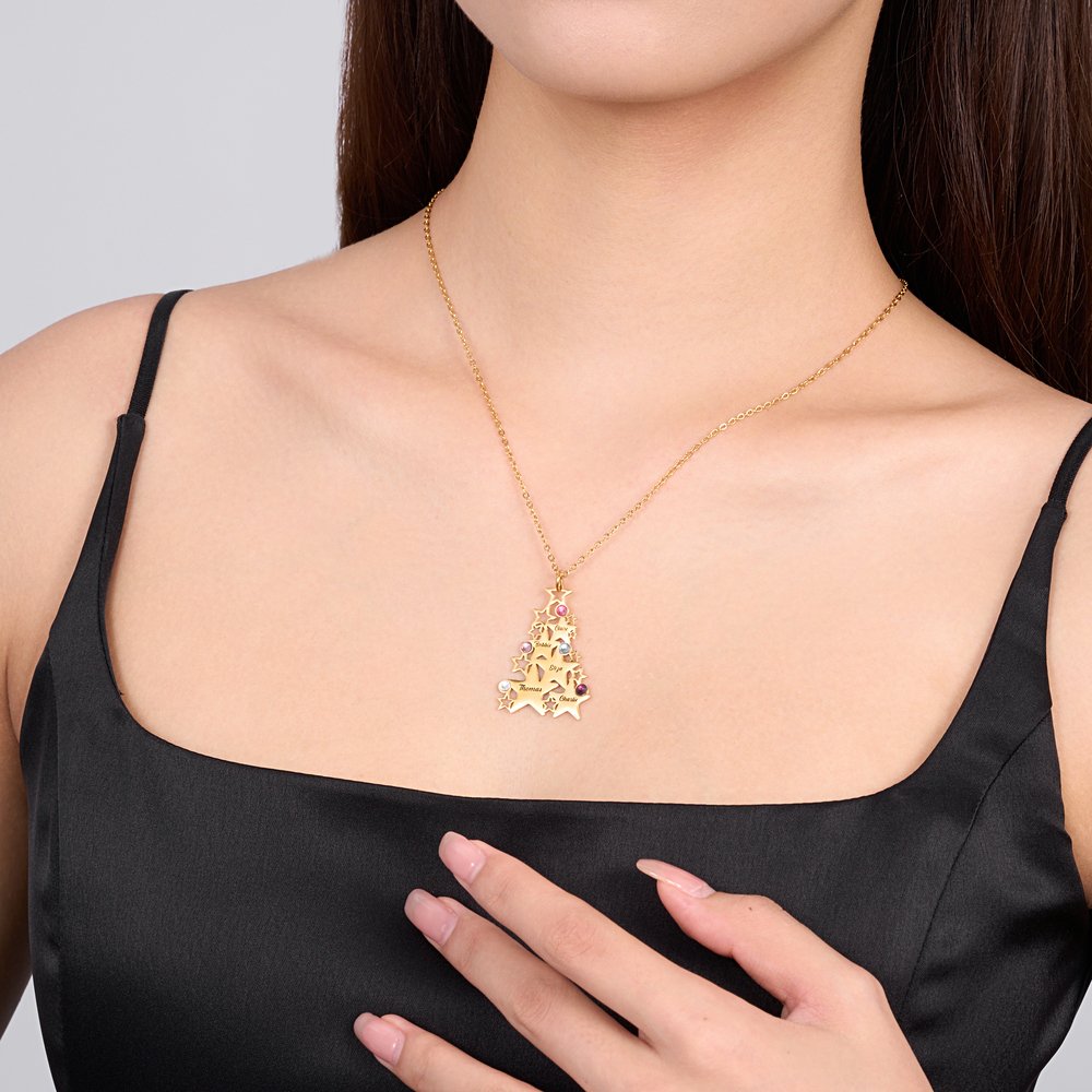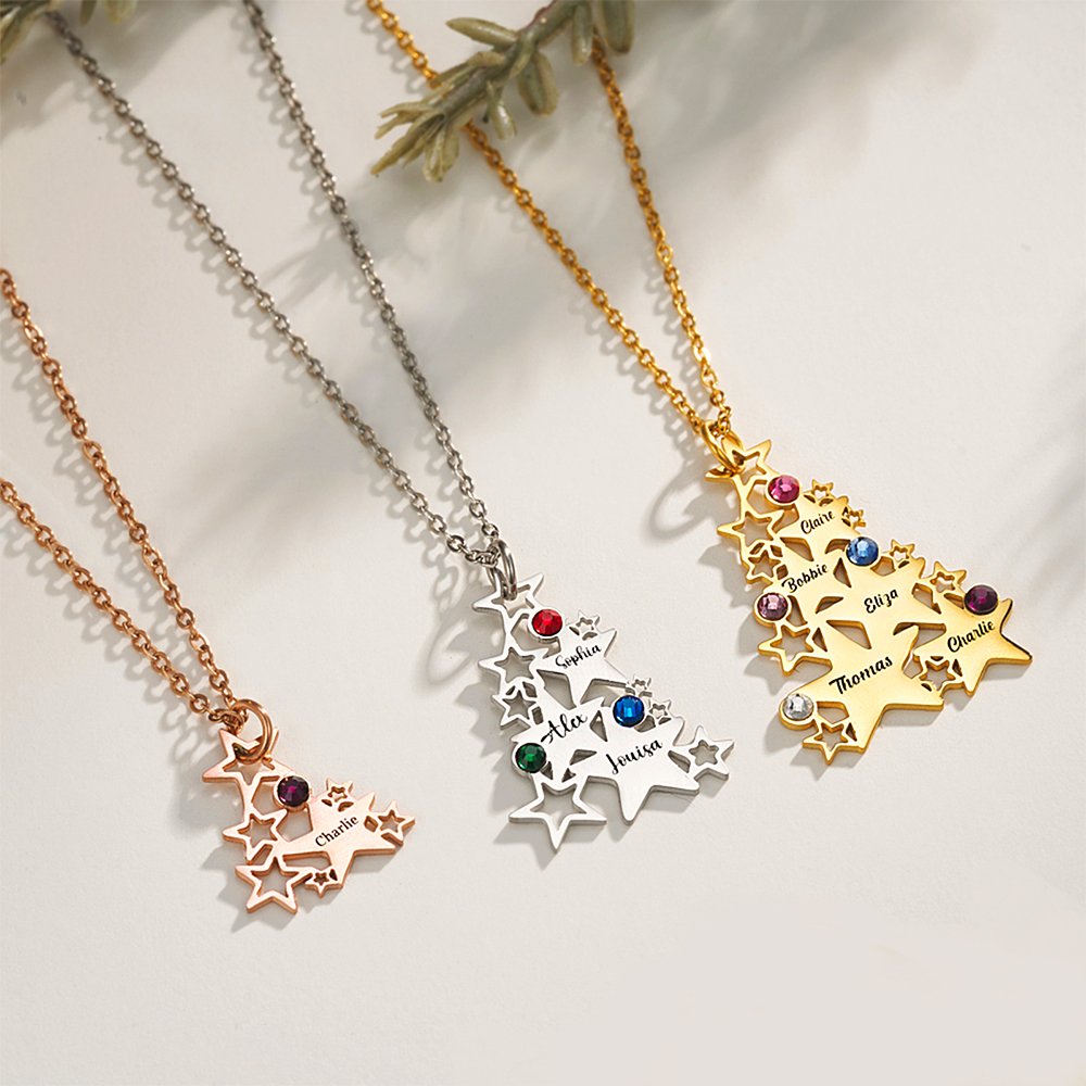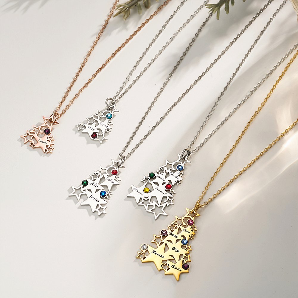 Inspirerat av julgranar och lysande stjärnor kombinerar detta halsband en festlig atmosfär med känslomässiga uttryck och symboliserar återförening, välsignelser och hopp. Halsbandet kan anpassas med 1-5 namn och motsvarande födelsestenar, vilket ger en unik betydelse för varje familjemedlem eller särskild person.