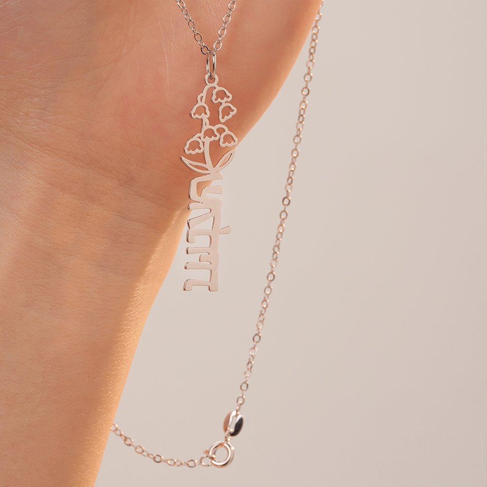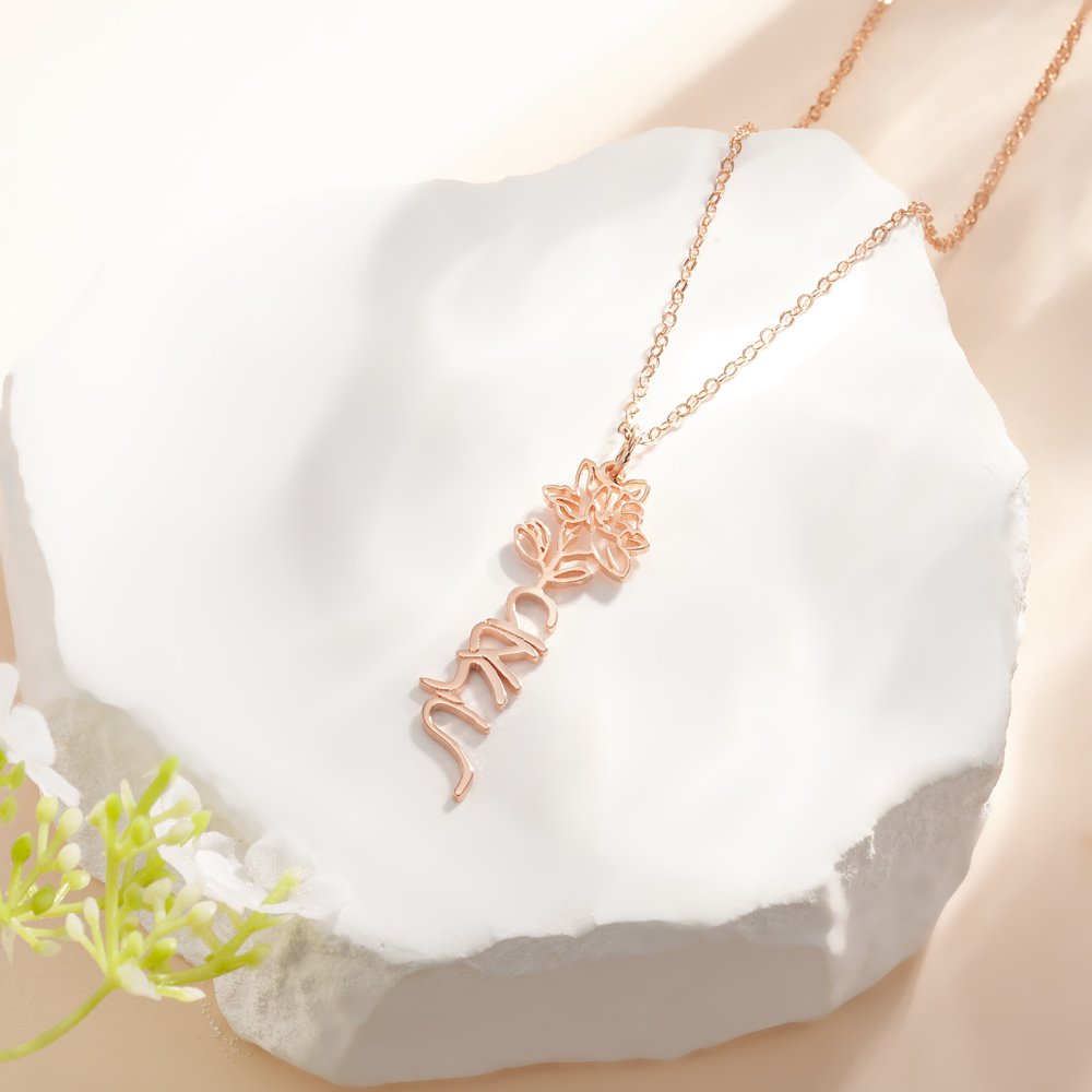 Detta halsband med en fin design av en födelseblomma och bärarens hebreiska namn är ett unikt och meningsfullt sätt att fira det judiska arvet. Oavsett om det är en gåva till en nära anhörig eller en uppskattad personlig accessoar är det ett vackert smycke.