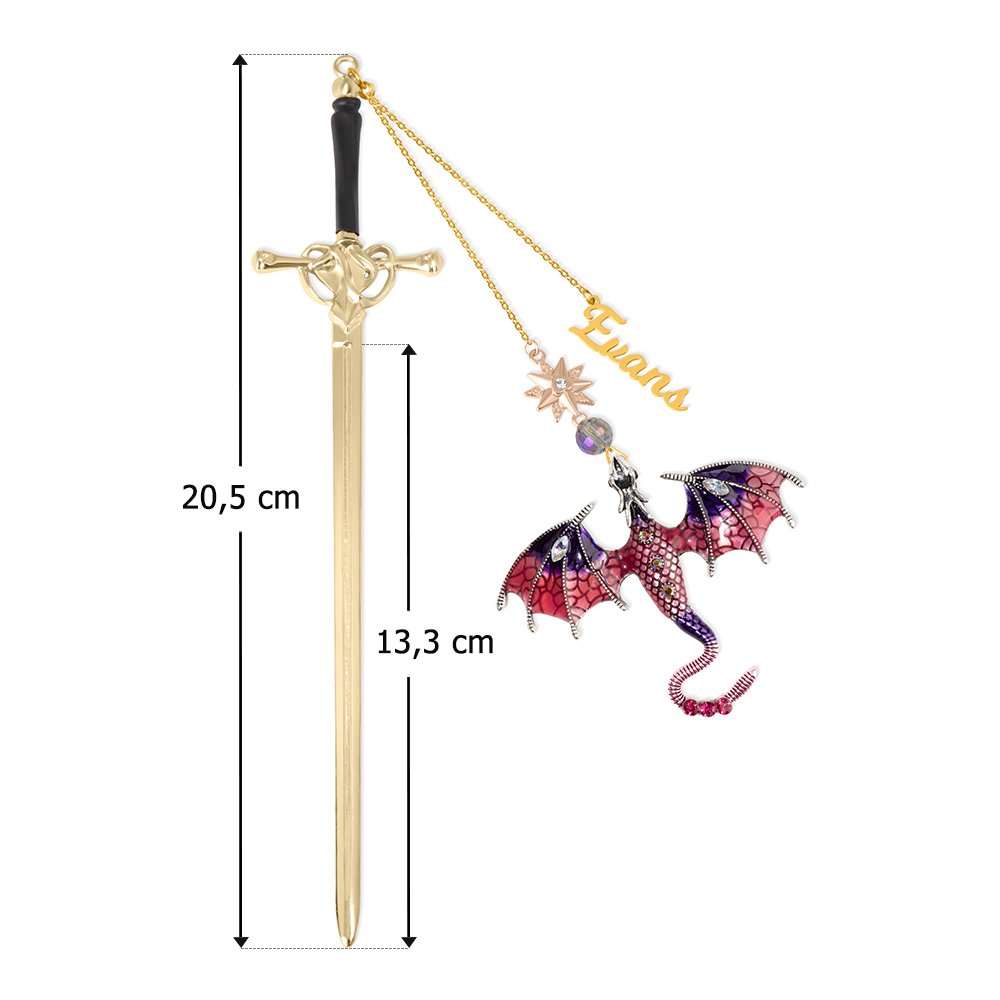 Detta bokmärke har intrikat designade drakar och svärdsmotiv. Den kraftfulla och kloka draken finns på ett guld- eller silversvärd som symboliserar styrka, mod och ära. Dessutom kommer bokmärket med en personlig namnetikett där du kan lägga till ditt namn för en unik och personlig prägel.