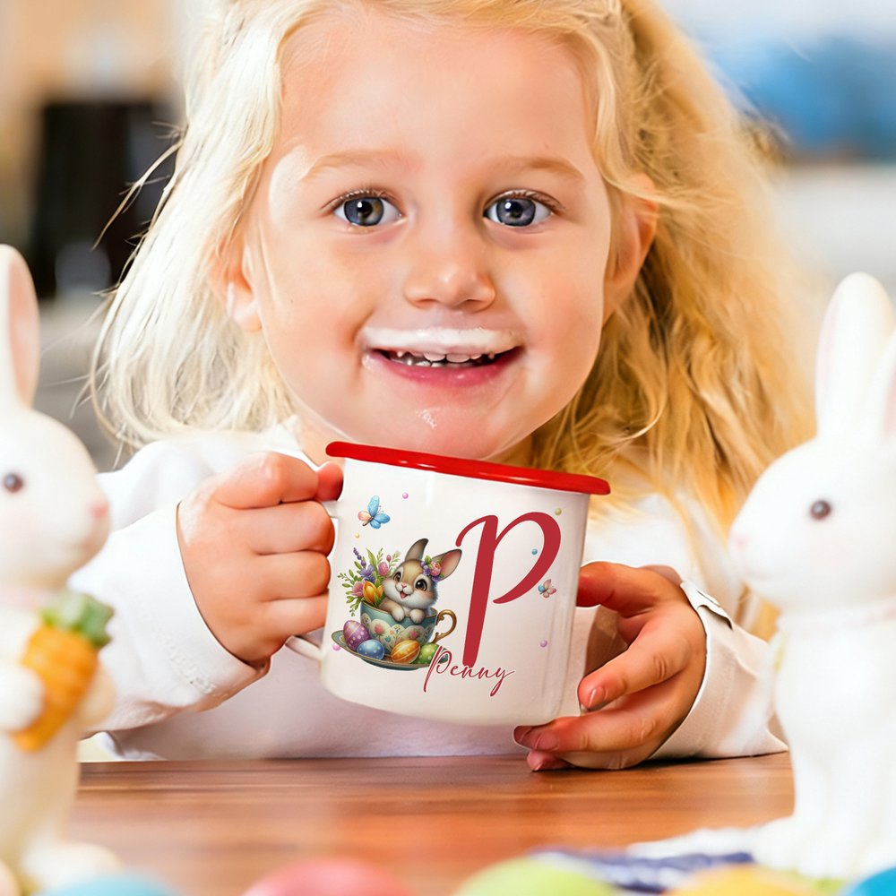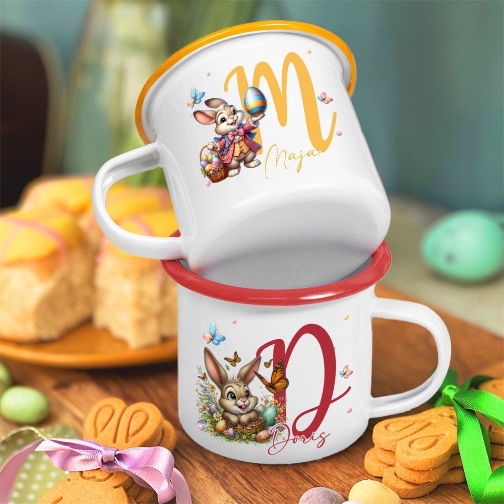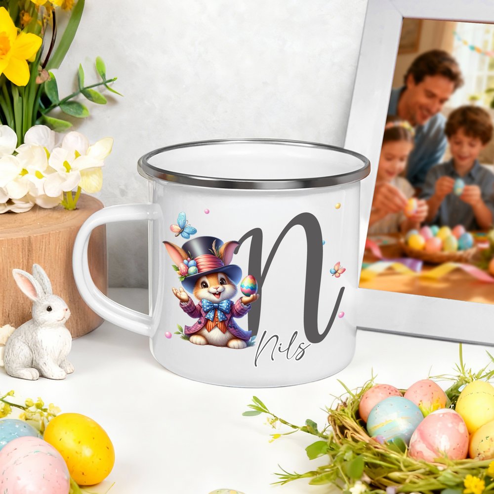 Med en charmig kaninillustration tillsammans med barnets namn och initialer skapas en lekfull och personlig design som sprider äkta påskglädje. Den söta och varma stilen gör varje fika lite roligare för både stora och små, och muggen blir snabbt en favorit vid frukostbordet.