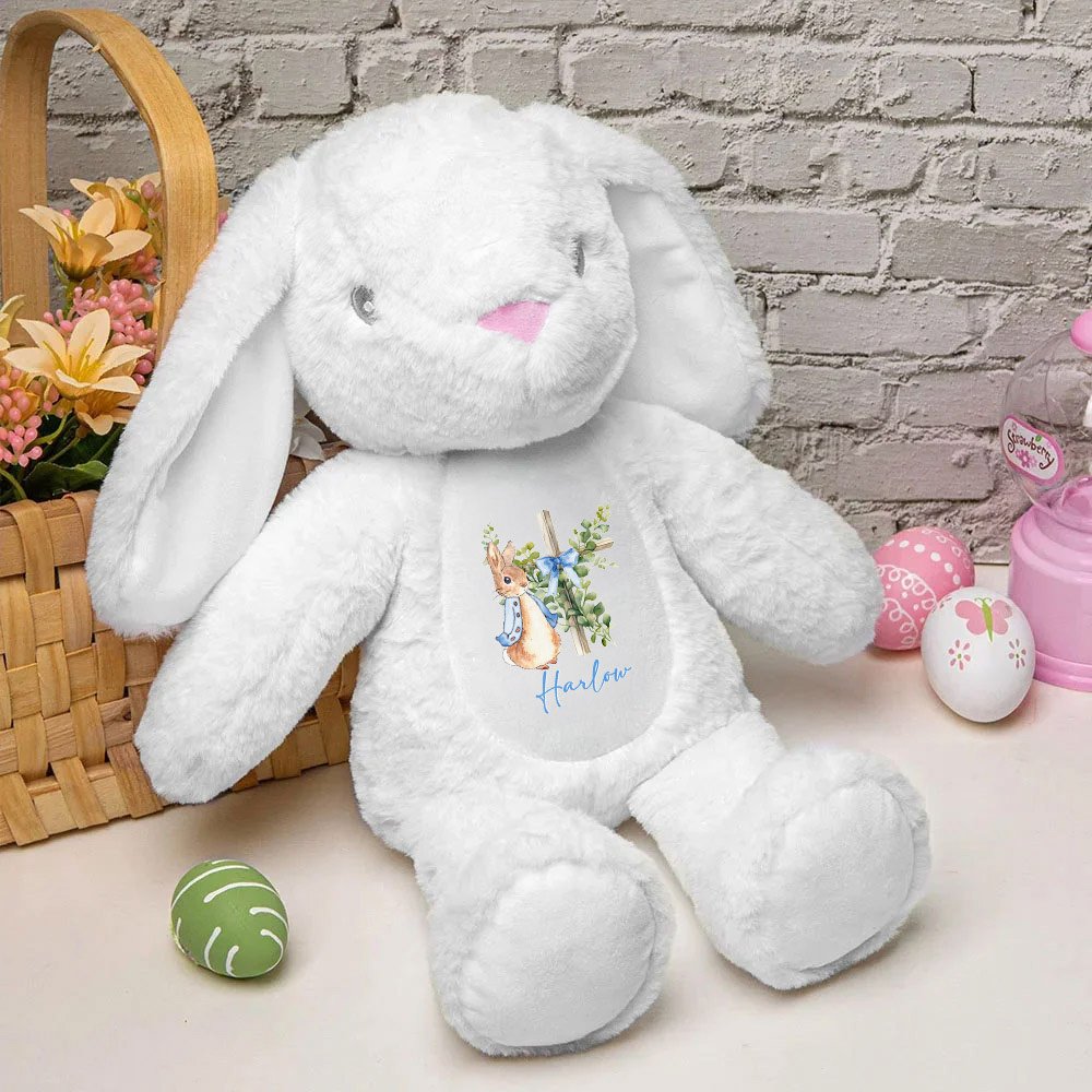 Den här underbara plyschkaninen har en charmig kanindesign med ett kryssmönster, vilket gör den till en perfekt påskpresent. Anpassa den med ett namn för att skapa en unik minnessak som fångar säsongens anda.