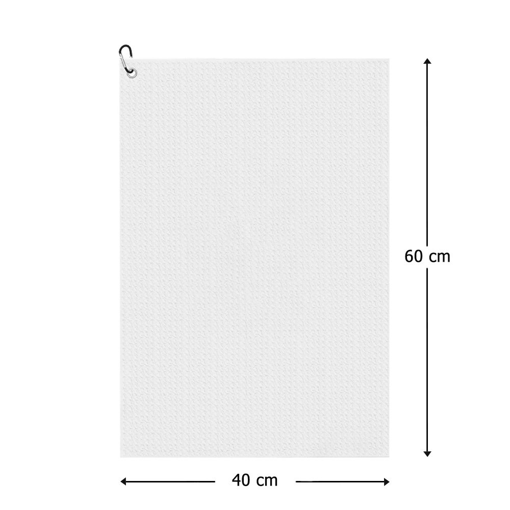 En hållbar karbinhake gör det enkelt att fästa handduken på golfbagar, vagnar eller bälten. Den är kompakt men generöst tilltagen (60 cm x 40 cm) och perfekt för användning på golfbanan eller driving range.