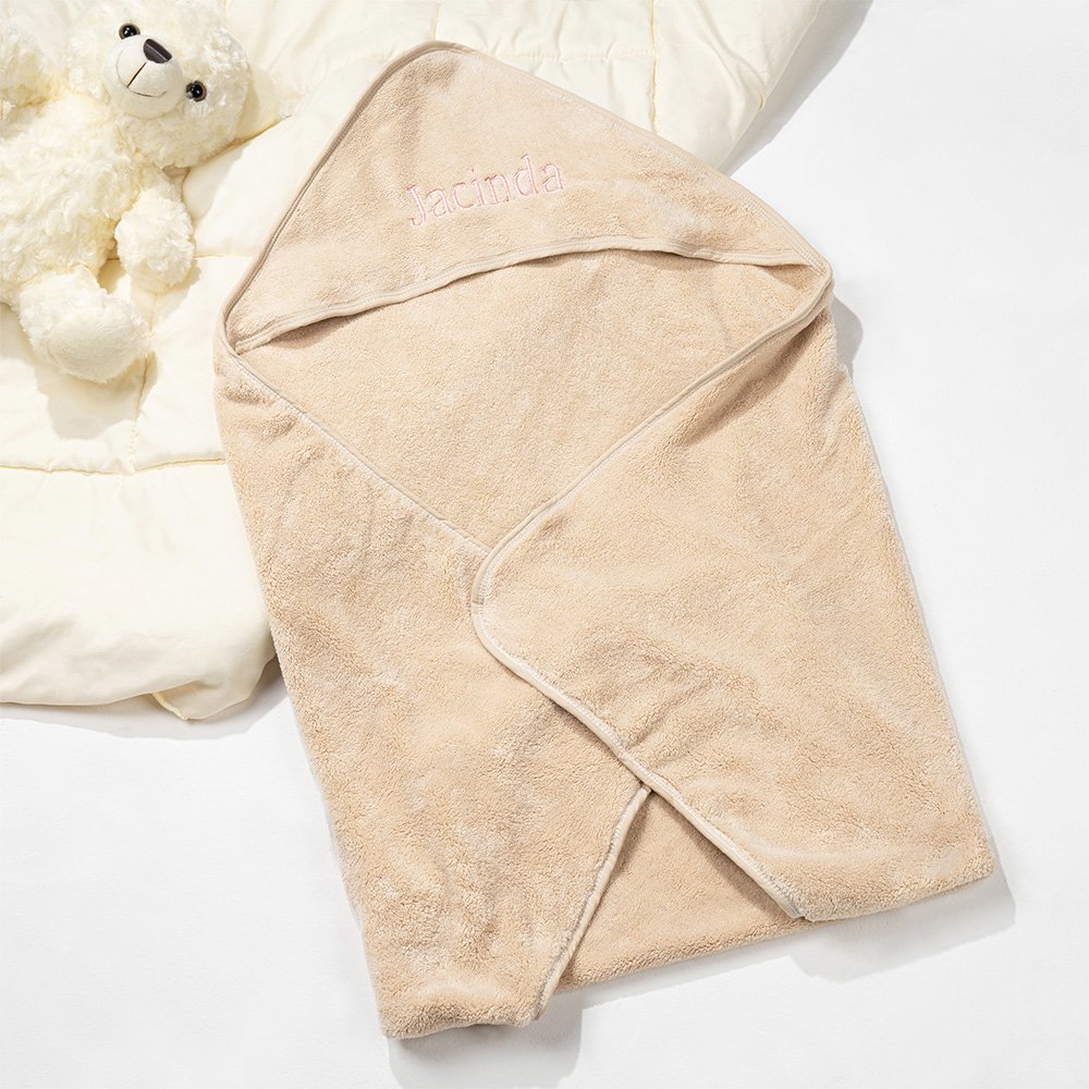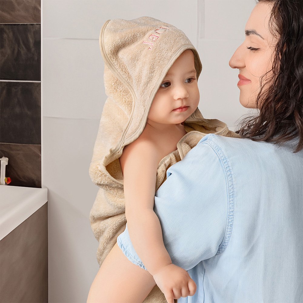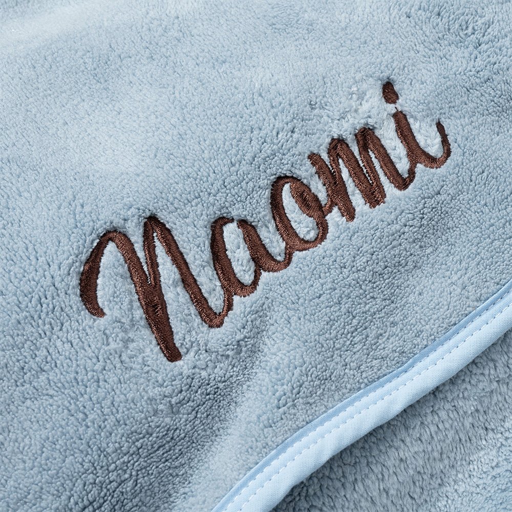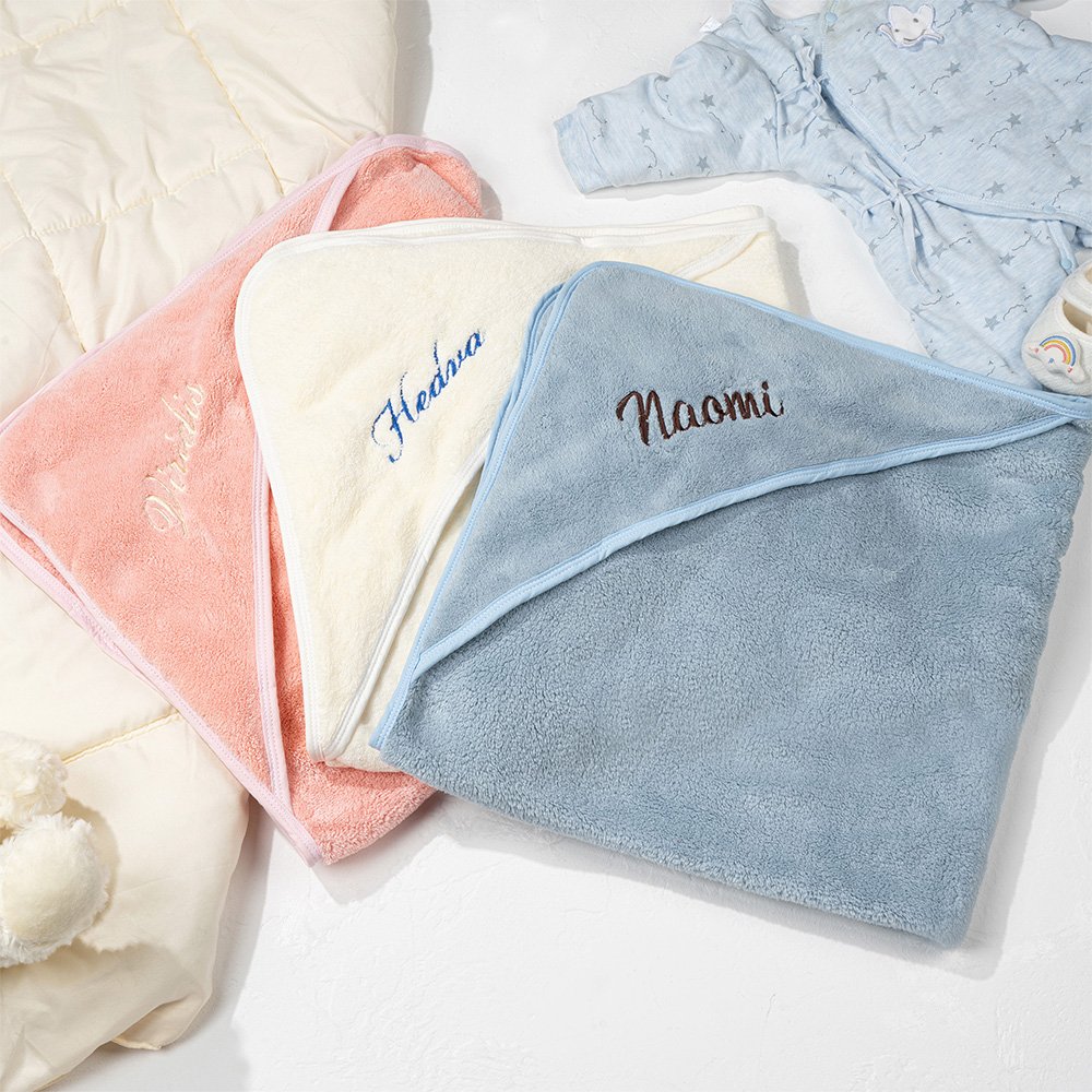 Vår handduk med huva ger mysig komfort för ditt lilla barn, finns i 6 lugnande färger och 4 broderade färger, med en enkel broderad namndesign, vilket skapar en unik minnessak som blir ditt barns eget minne.