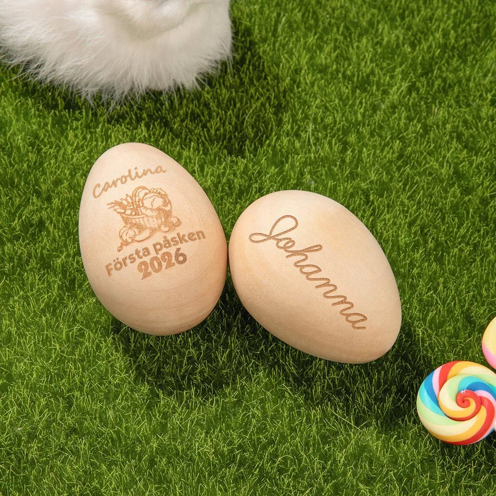 Vi använder noggrant utvalt naturträ som slipats till en silkeslen finish utan stickor - säkert för både barn och miljö. Varje ägg är unikt tack vare träets naturliga ådring och varma struktur. Den precisionsgjorda gravyren ger en tydlig text som håller över tid, vilket gör ägget till ett värdefullt minne som kan bevaras i många år.