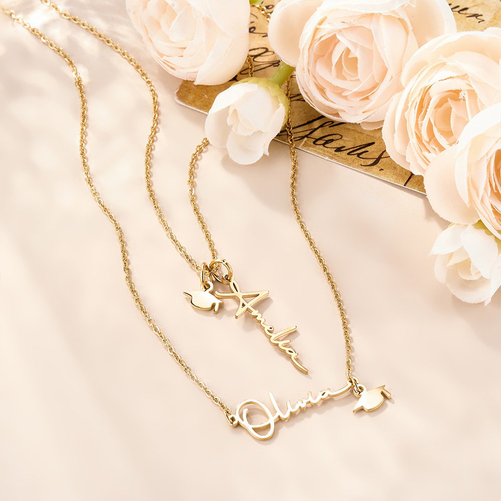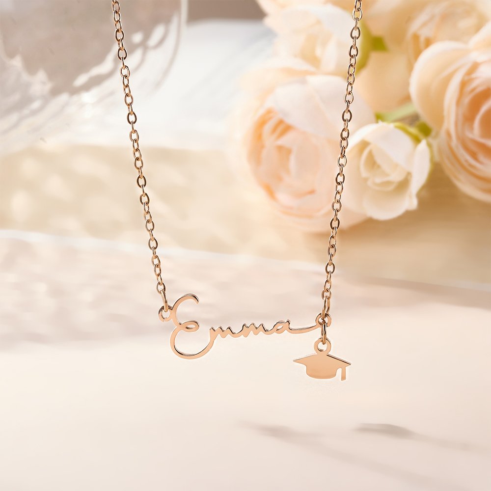 Hängsmycket på detta halsband är utformat som ett eget namn med en examensmössa, vilket markerar "prestationen" att ta examen. Du kan lägga till ditt namn för att göra halsbandet unikt.
