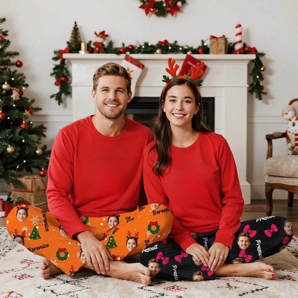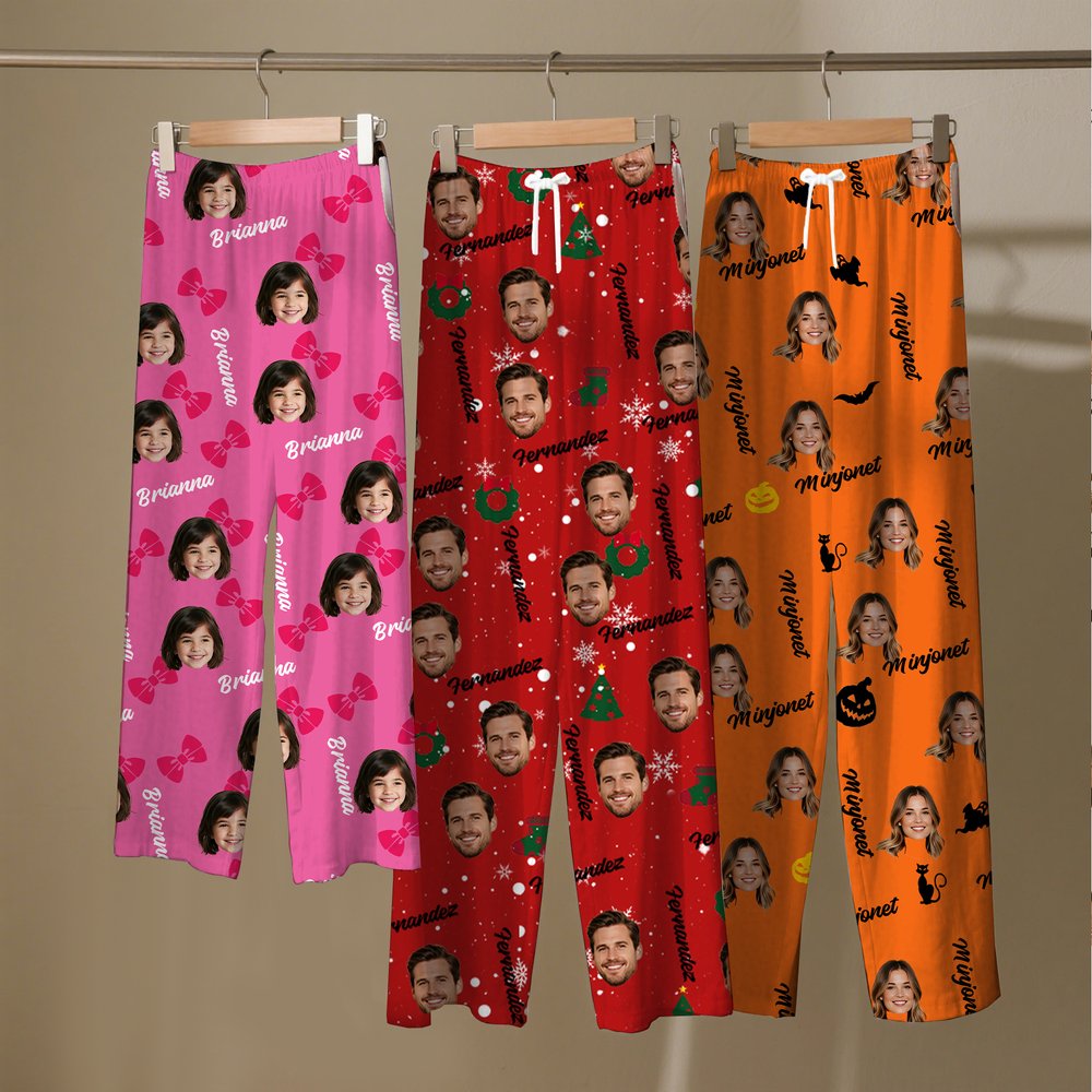 Dessa pyjamasbyxor är utsmyckade med rosetter, frukt, Halloween-element och julmotiv, tillsammans med anpassningsbara personliga eller paravatarer och namn, vilket skapar en livlig och lekfull design. Det bedårande ansiktstrycket med tryck bryter monotonin hos traditionella loungekläder och skapar en kawaii-look samtidigt som det ger en personlig touch, vilket gör hemkläder snygga och personliga.