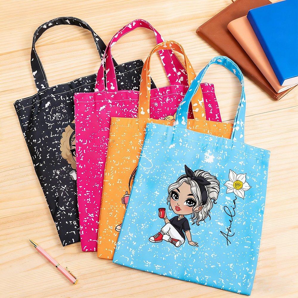 Denna väska innehåller en tecknad figur av en flicka och genomarbetade blomsterelement. Den tecknade flickan bär avslappnade och energiska kläder som visar ungdomens charm. Väskan är också prickad med vita fläckar, den är både modern och personlig. Dessutom kan namnet anpassas på väskan, vilket ger en unik modekänsla till den.