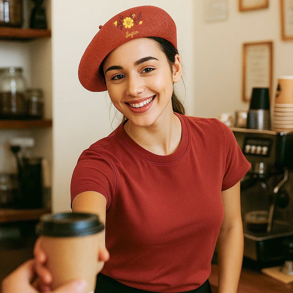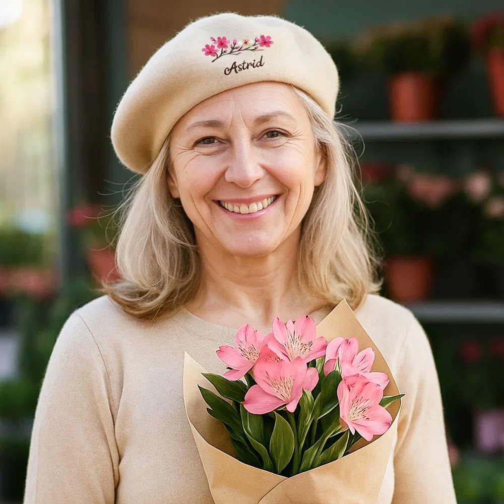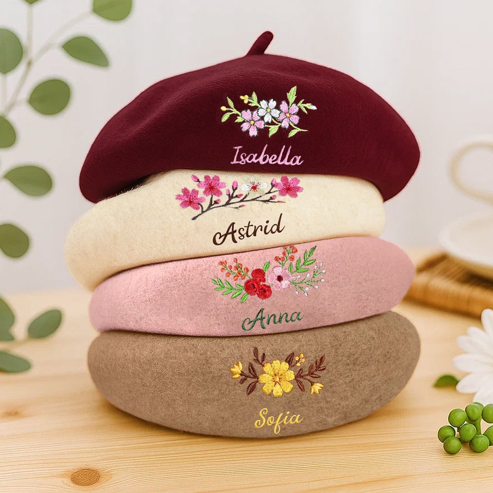 Med ett färgstarkt blomsterbroderi som kärndesign, i kombination med anpassningsbara namn och en vintageinspirerad fransk basker-silhuett, blandar denna design klassisk charm med modern vitalitet. Blomsterbroderiet bryter monotoni hos traditionella baskrar och ger den retroinspirerade formen ett samtida lyft, vilket gör accessoaren mer än bara vanlig.