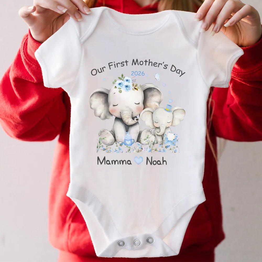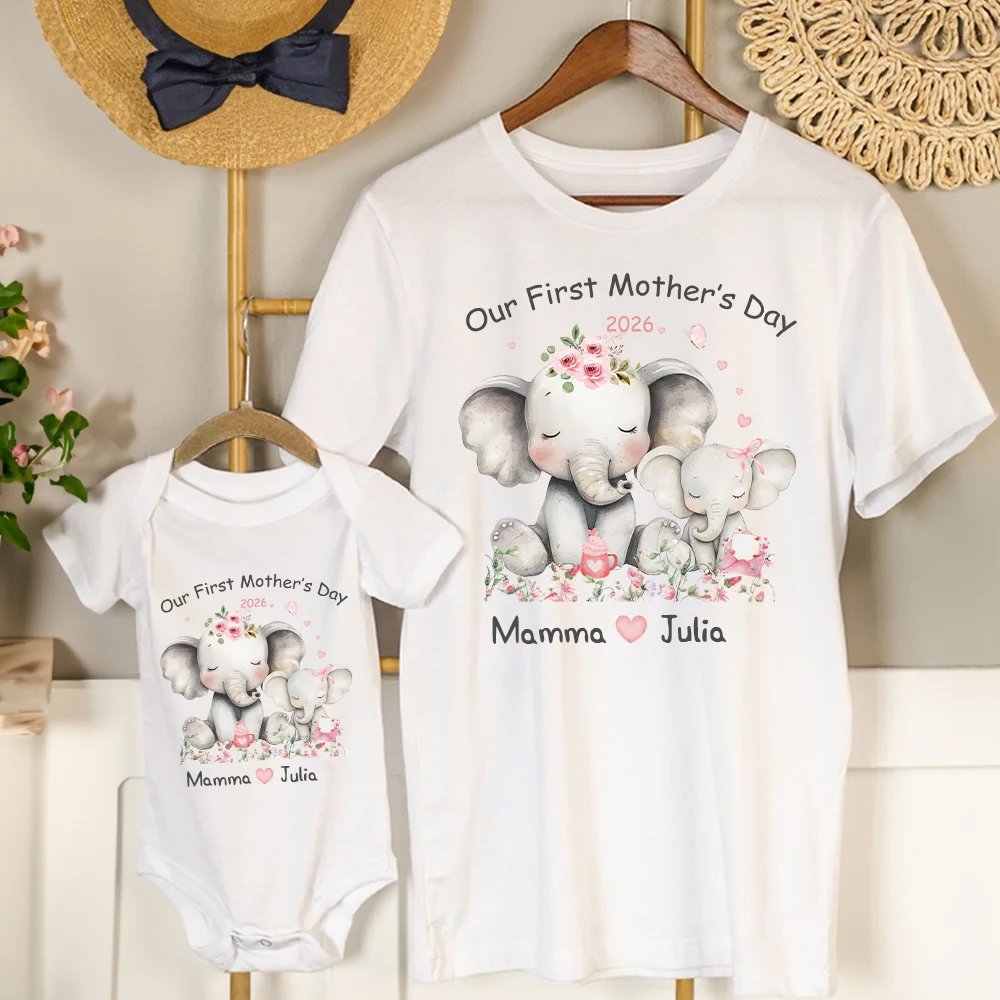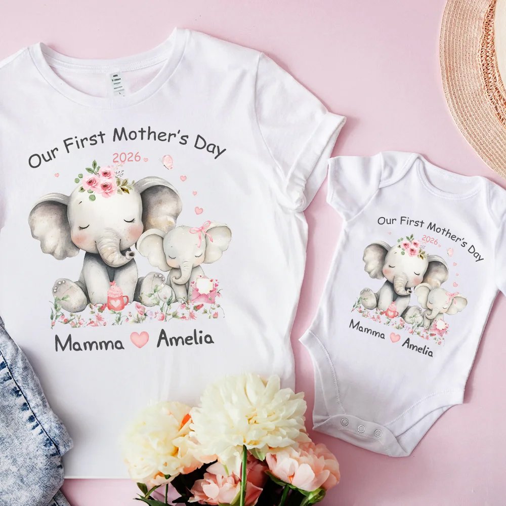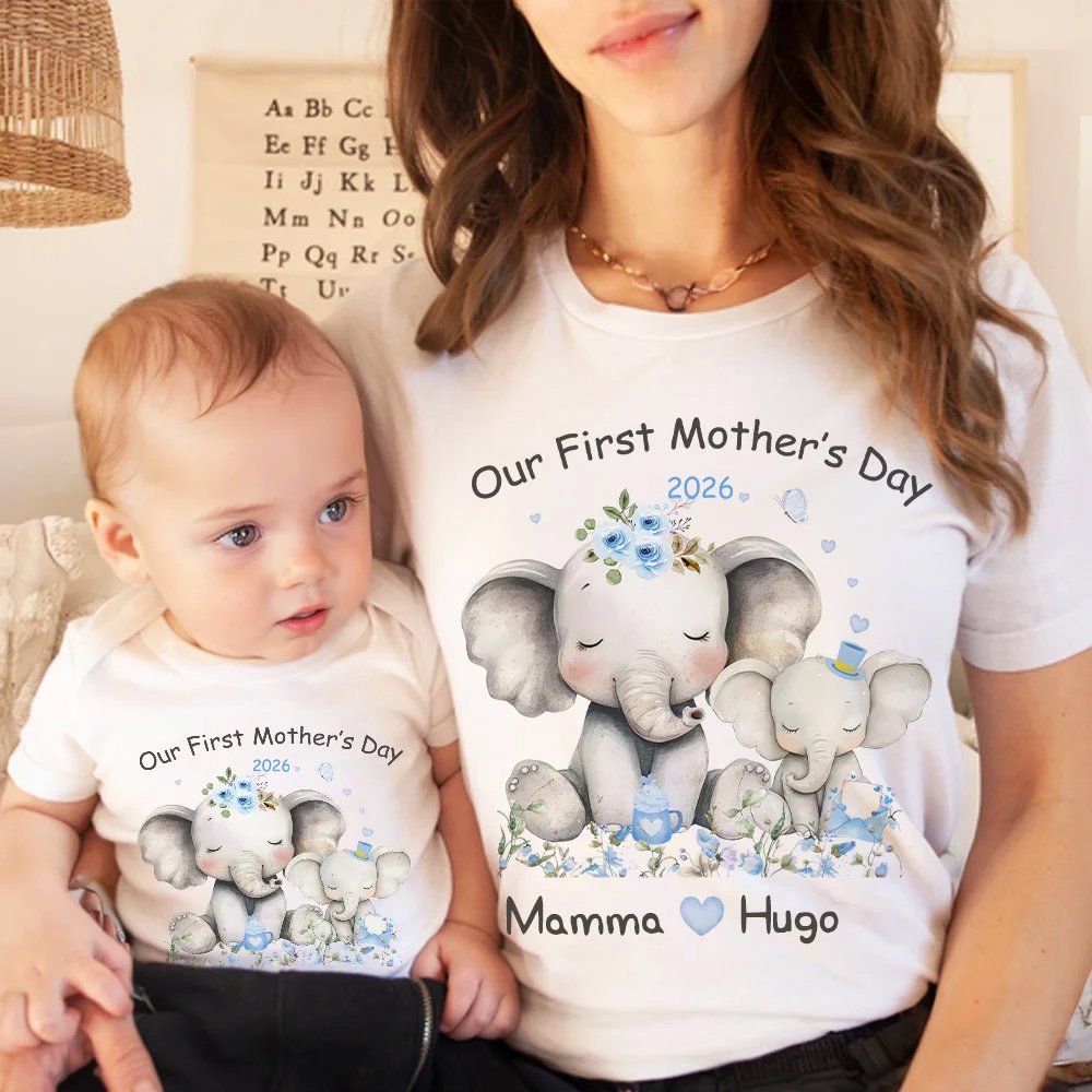 Fira kärleken med detta matchande set för mamma och barn! Designen pryds av en kärleksfull elefantfamilj omgiven av vackra blommor - en symbol för det unika bandet mellan mor och barn. Med texten "Our First Mother's Day" och personligt namn blir dessa plagg ett exklusivt minne som ni kan bära med stolthet.