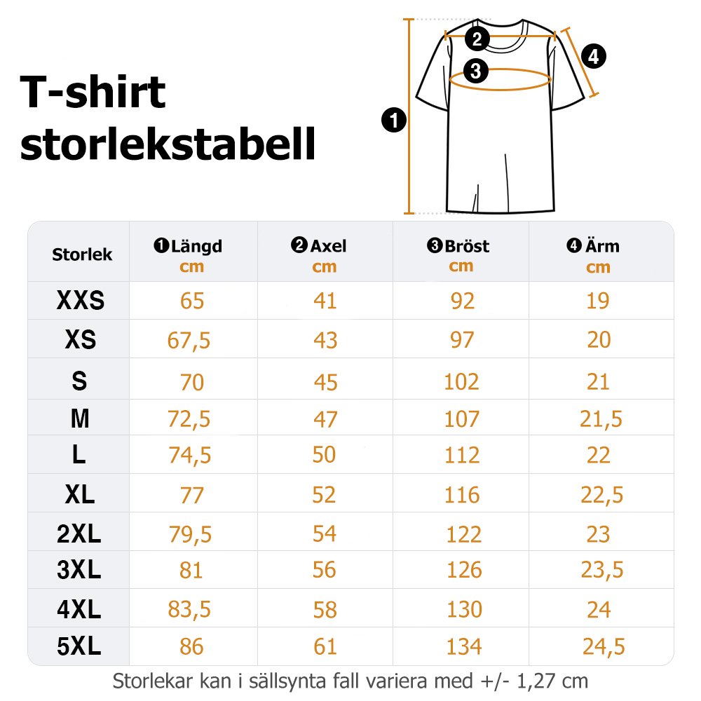| Mätning: | Babybody: 0-3 mån, 6 mån, 12 mån, 18 mån, 2 år T-shirt: XXS, XS, S, M, L, XL, 2XL, 3XL, 4XL, 5XL |