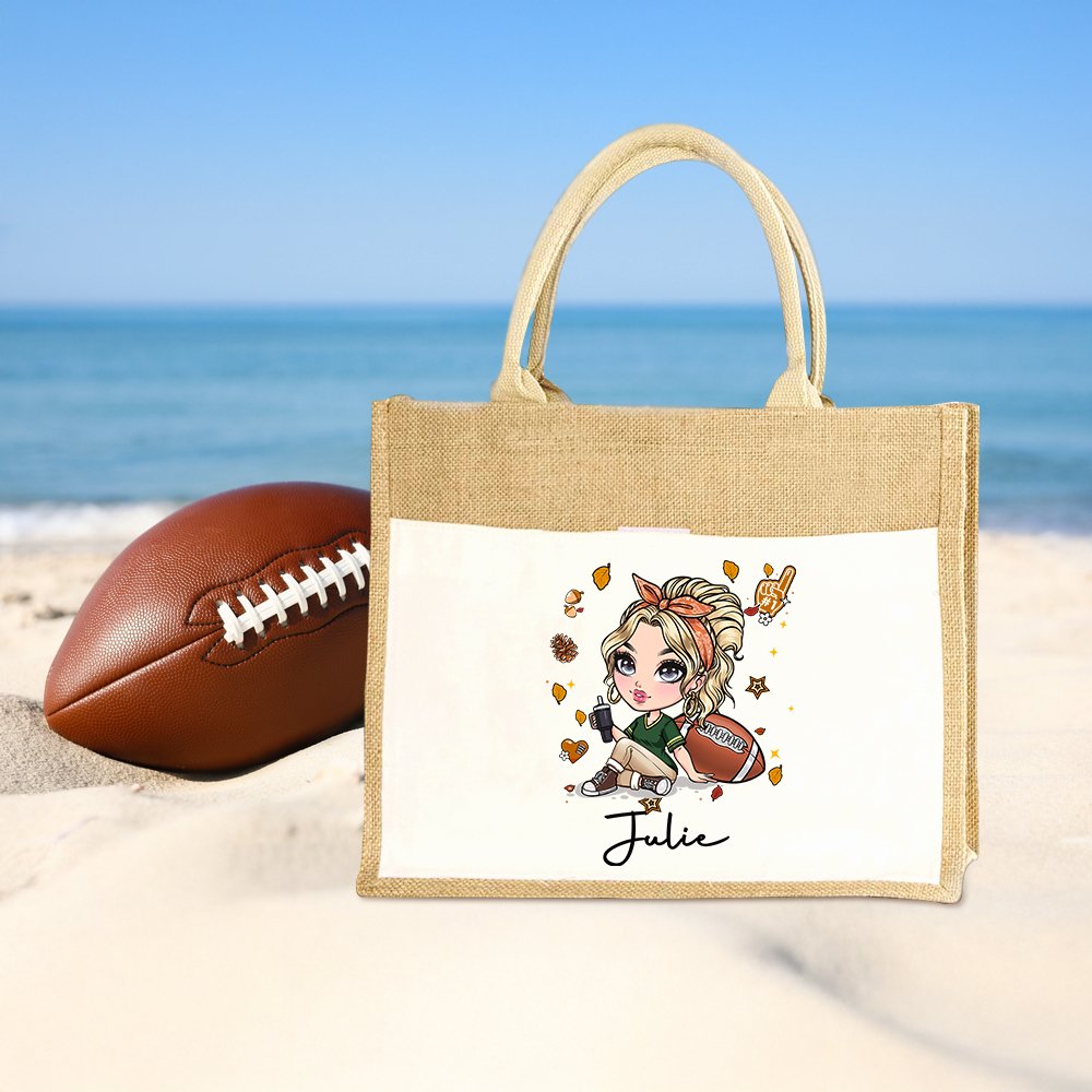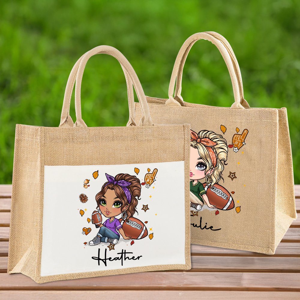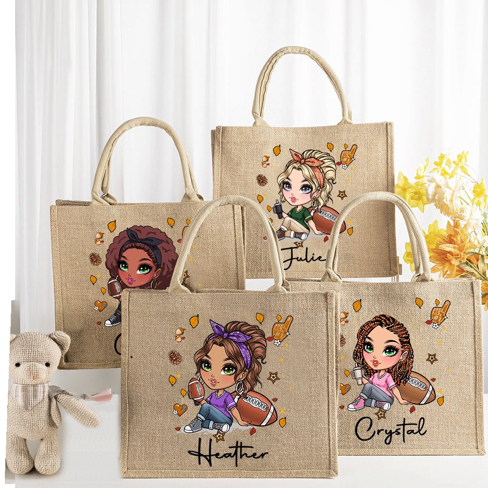 Personlig fotboll tecknad flicka stor jute Tote väska med namn resor Essentials födelsedagspresent för kvinnor