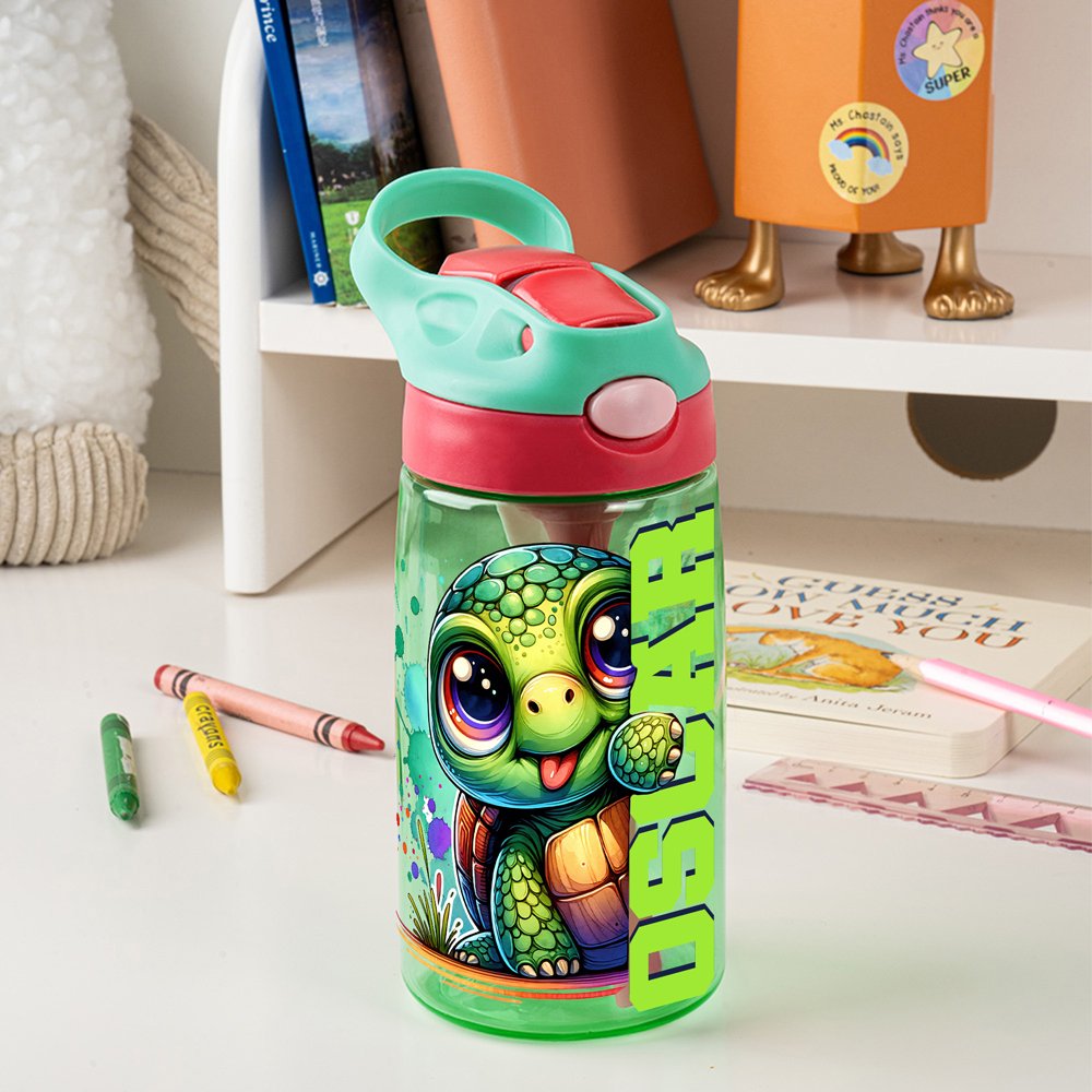 Fyrtio färgglada djurfigurer – från pandor och rävar till krokodiler – pryder dessa flaskor mot lekfulla akvarellbakgrunder. Med barnets namn på flaskan blir den personlig och unik, en rolig accessoar som barnet gärna visar upp för sina vänner.