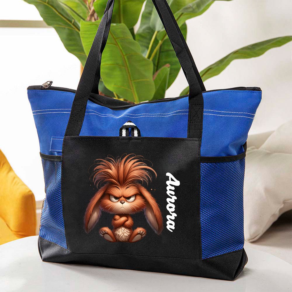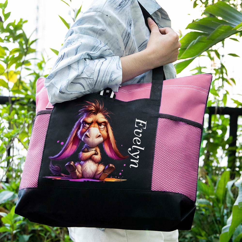Personlig rolig tecknad grinig djur stor canvas tygkasse med nätficka för arbete resor födelsedagspresent för kvinnor