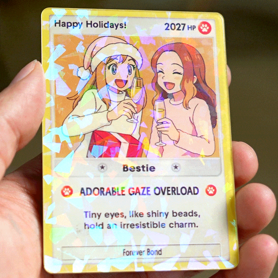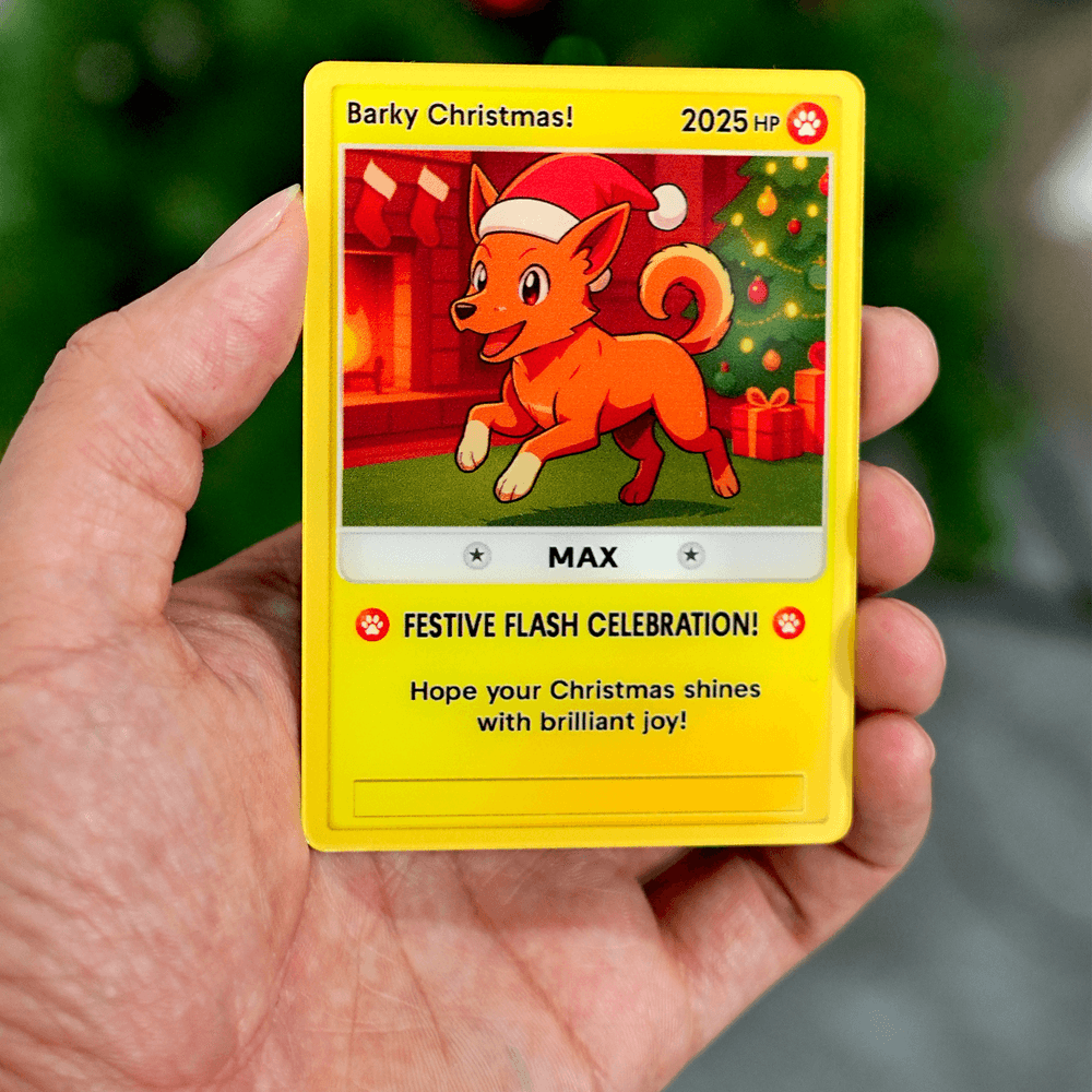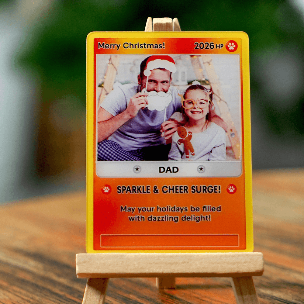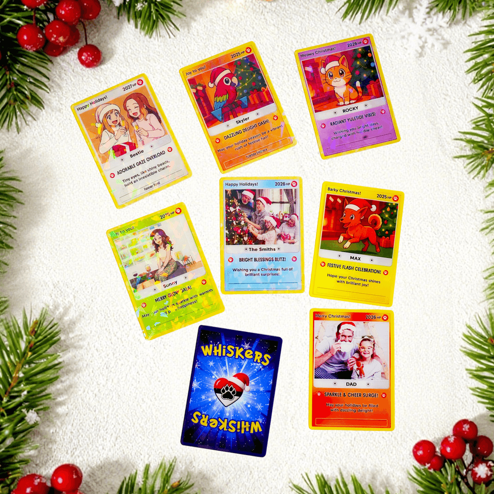 Ladda upp ett foto av ditt husdjur eller någon annan värdefull bild, så skapar vi ett unikt kort som är skräddarsytt efter dina specifikationer. Vi skräddarsyr kortet med dina hälso- och årspoäng, titel, namn, attacknamn, attackbeskrivning och bottentext. Vi erbjuder både vanliga och splittrade glitterkort. Splittrade glitterkort skapar en bländande och varierad reflektionseffekt när de utsätts för ljus, vilket gör dina anpassade kort ännu mer bländande.