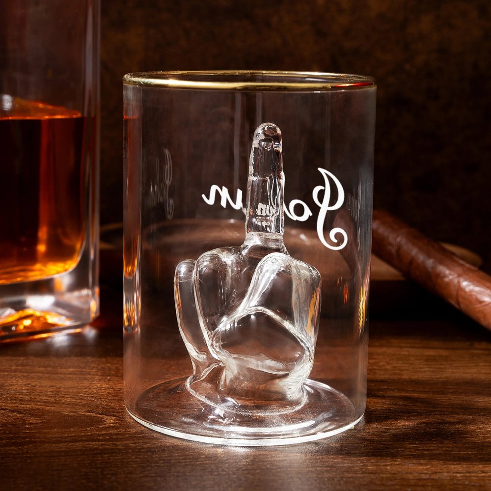 Gör helgens skönaste stund ännu lite roligare! Detta whiskyglas med sin kaxiga långfinger-design är den perfekta följeslagaren till fredagsmyset. Du kan anpassa glaset med ditt namn eller en personlig hälsning i två olika typsnitt. Det är en detalj som garanterat höjer stämningen och blir en snackis oavsett om du njuter av en drink i din ensamhet eller skålar in helgen med vännerna.