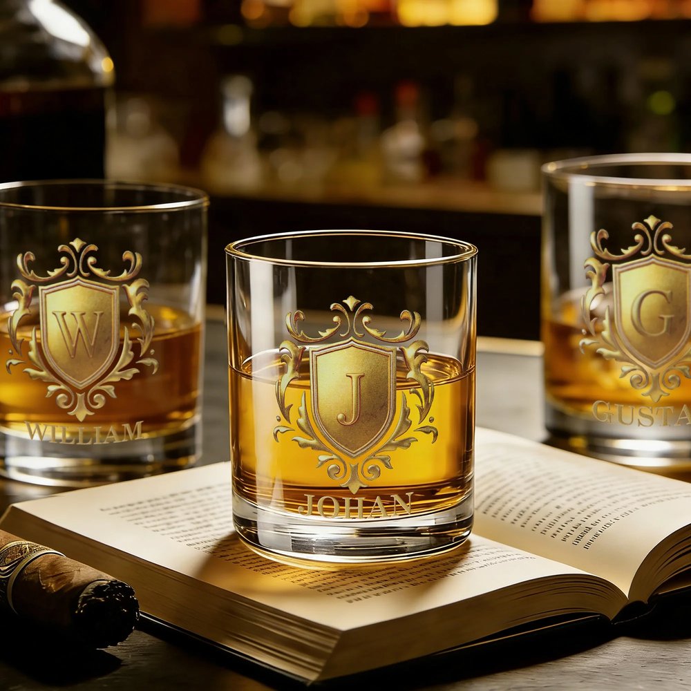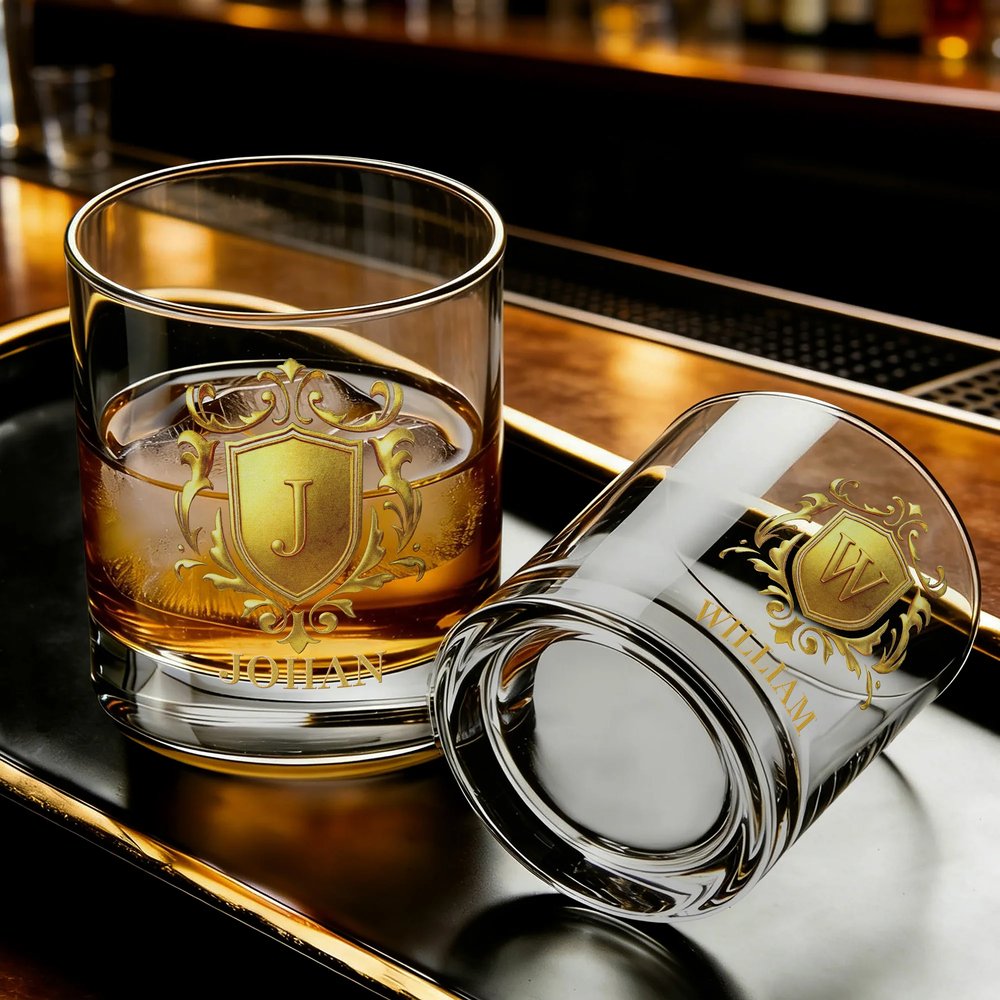 Med designelementet "golden shield" och personlig namnanpassning får glaset en dynamisk och realistisk effekt. Samspelet mellan ljus och skugga ger ett djup och en textur som bryter mot det monotona hos vanliga glasvaror. Namnet graveras med ett elegant typsnitt, vilket gör varje glas till en unik identifikation för mottagaren.