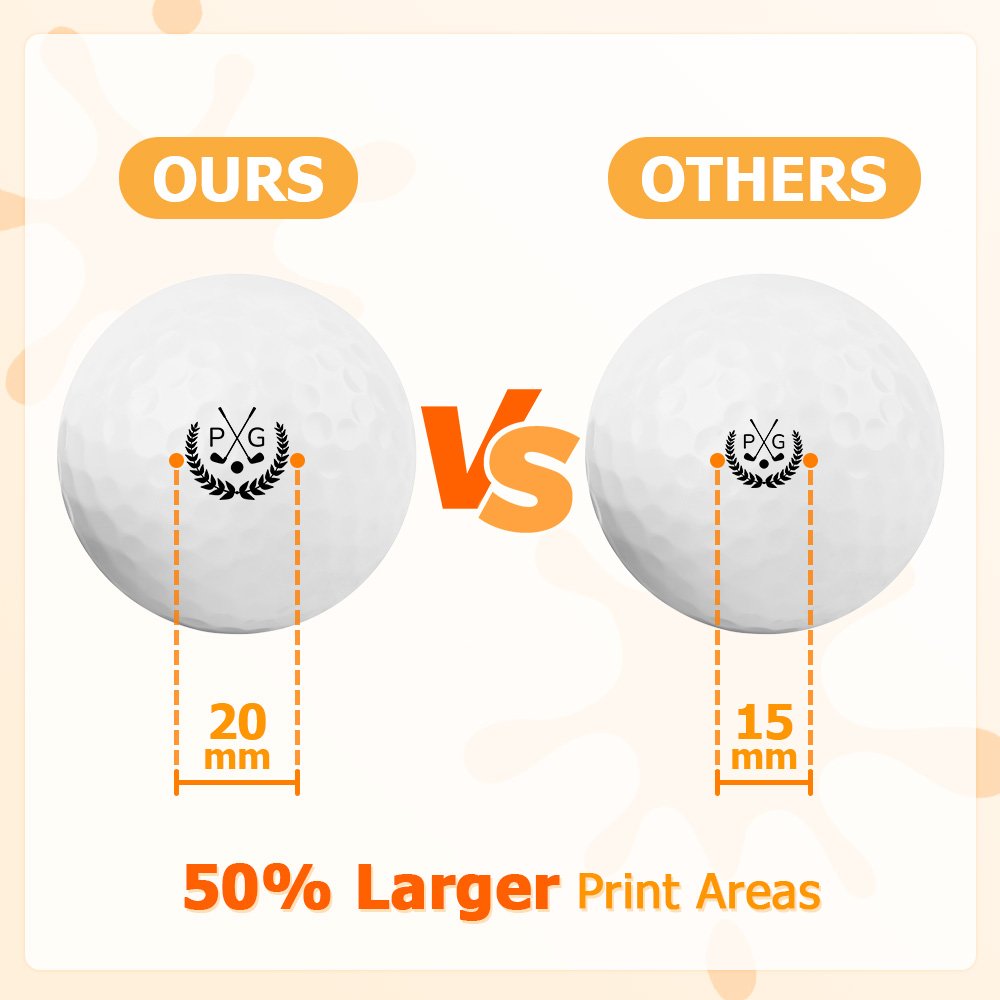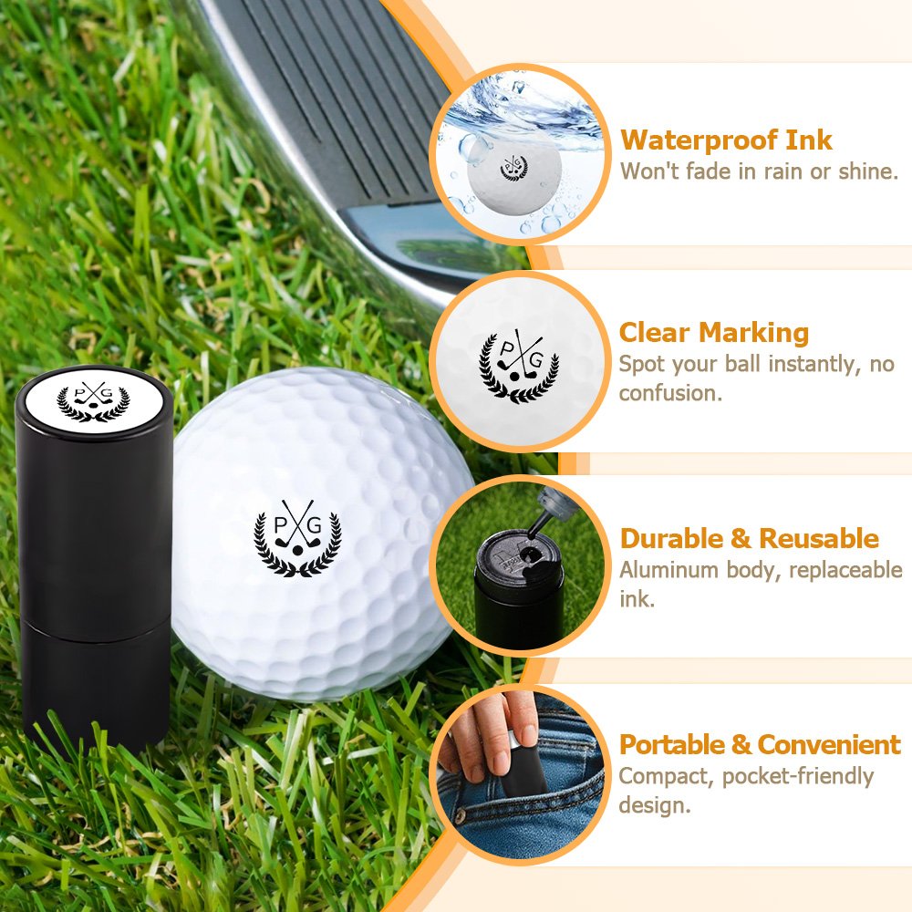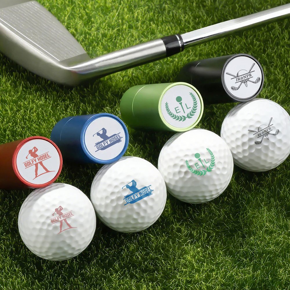 Välj bland 20 mönster med golftema, inklusive swing-silhuetter, korsade klubbor och sköldemblem. Varje boll kan göras personlig med ett namn eller initialer. Varje design finns i fyra olika färger och trycks tydligt för en professionell look på banan.