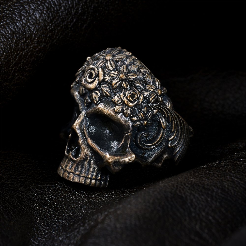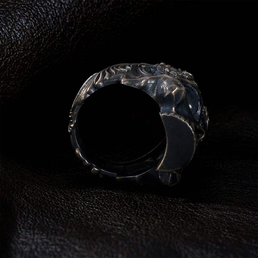 Ringens hantverk har ägnat stor uppmärksamhet åt detaljer, där dödskallens form är omsorgsfullt utskuren för att skapa en distinkt, tredimensionell textur. Den slitna finishen är naturlig och realistisk, utan några hårda märken, vilket säkerställer att ringen behåller sin distinkta gotiska känsla över tid. Kombinationen av material och hantverk säkerställer att ringen är både visuellt slående och hållbar, perfekt för långvarig användning eller samling.