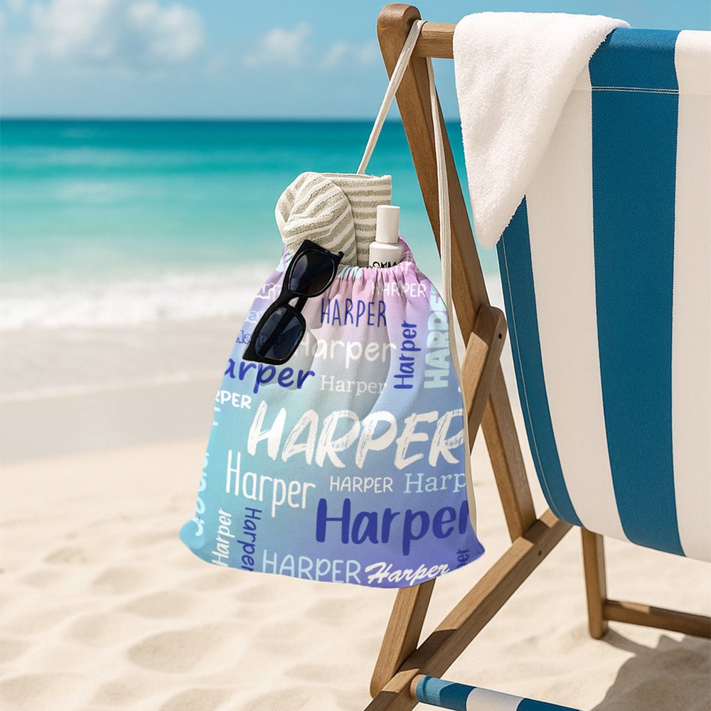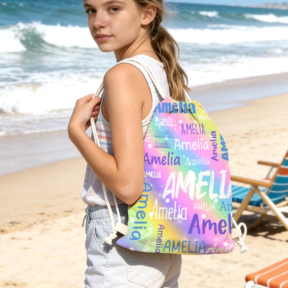 Personlig Gradient Färg Ordmoln Dragsko Strandryggsäck med namn Strandfest Födelsedagspresent för barn Vuxna