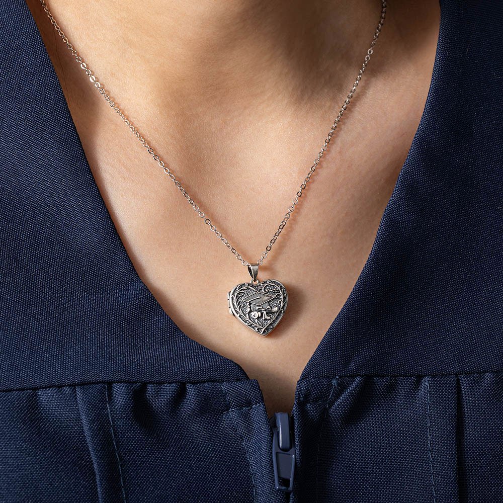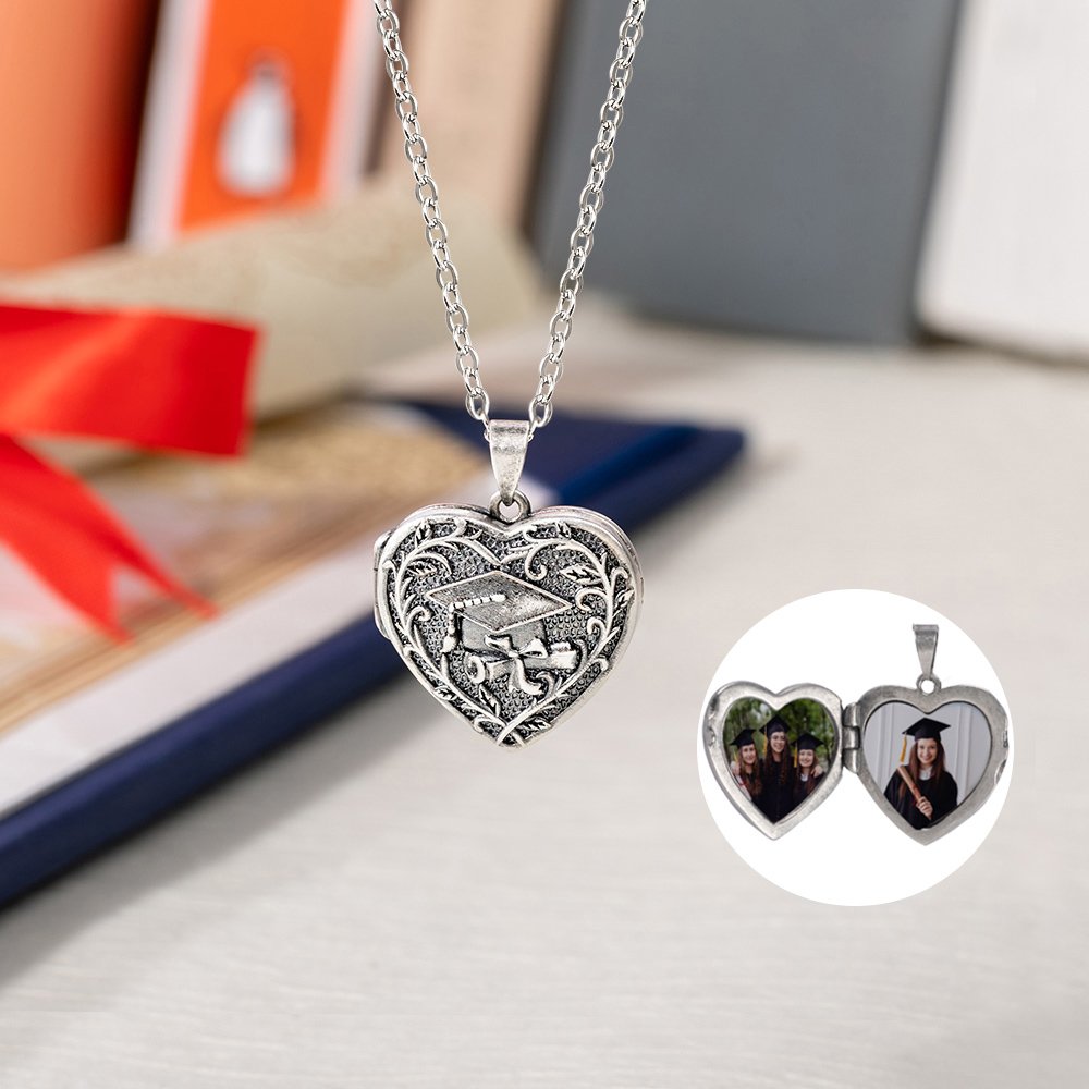 Detta medaljonghalsband har en examensmössa, vintagemönster och vintagehjärtform och kan göras personligt med 1-2 älskade foton. Möjligheten att anpassa gör det till en unik och omtänksam gåva till alla som tar examen. Hjärtmedaljongen kan öppnas och stängas.