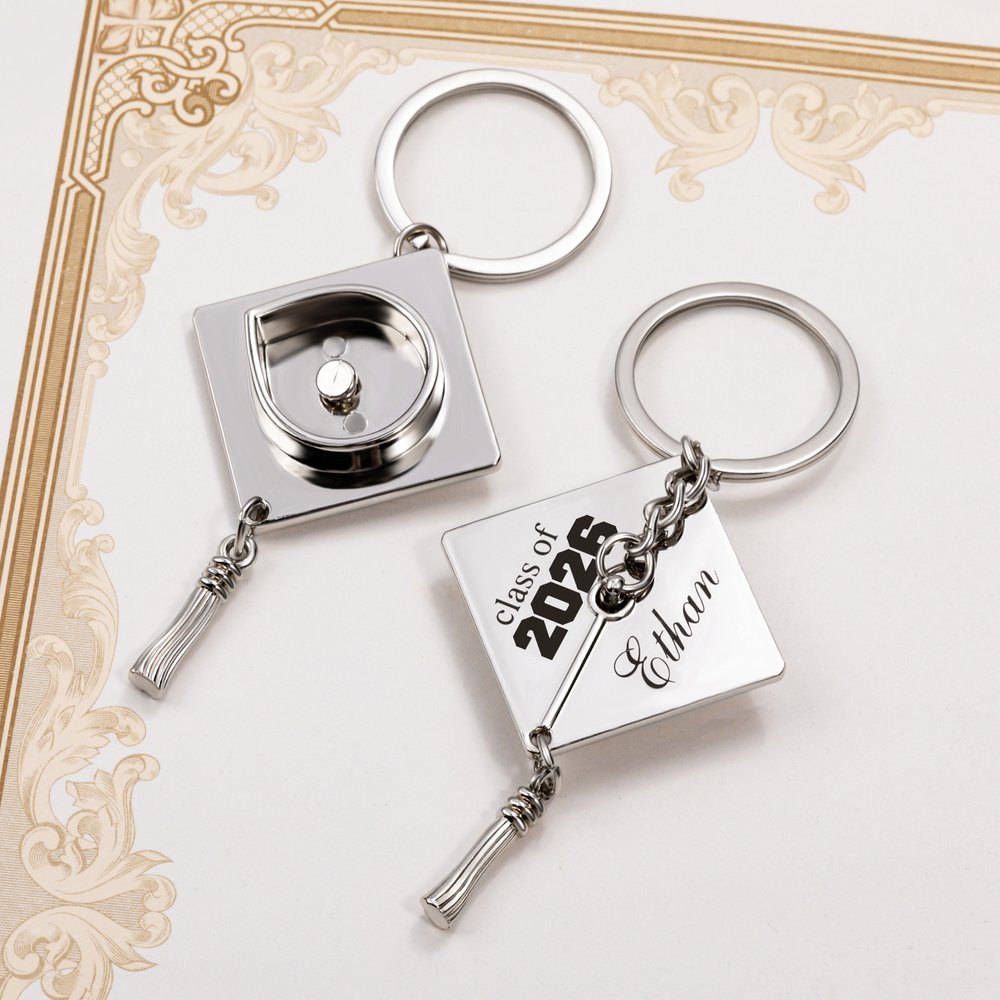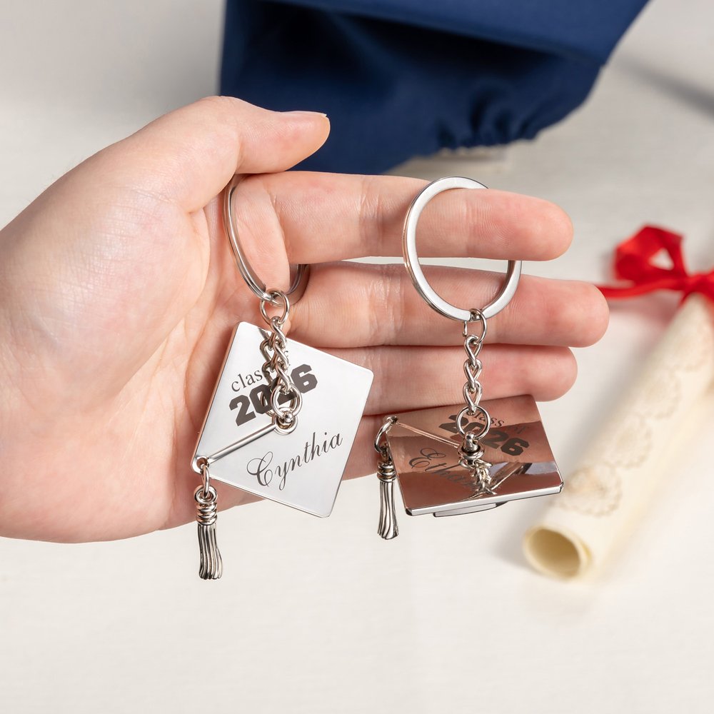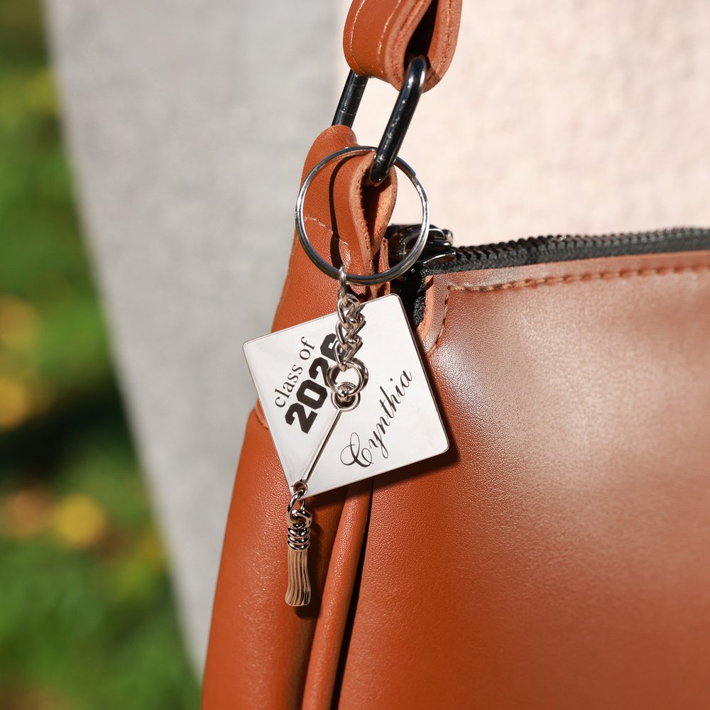 En studentmössa inspirerar denna nyckelring och designen med tofsar gör den mer ungdomlig och energisk. Dessutom kan du anpassa ditt namn och år, vilket gör den här produkten till en meningsfull minnesgåva för examen.