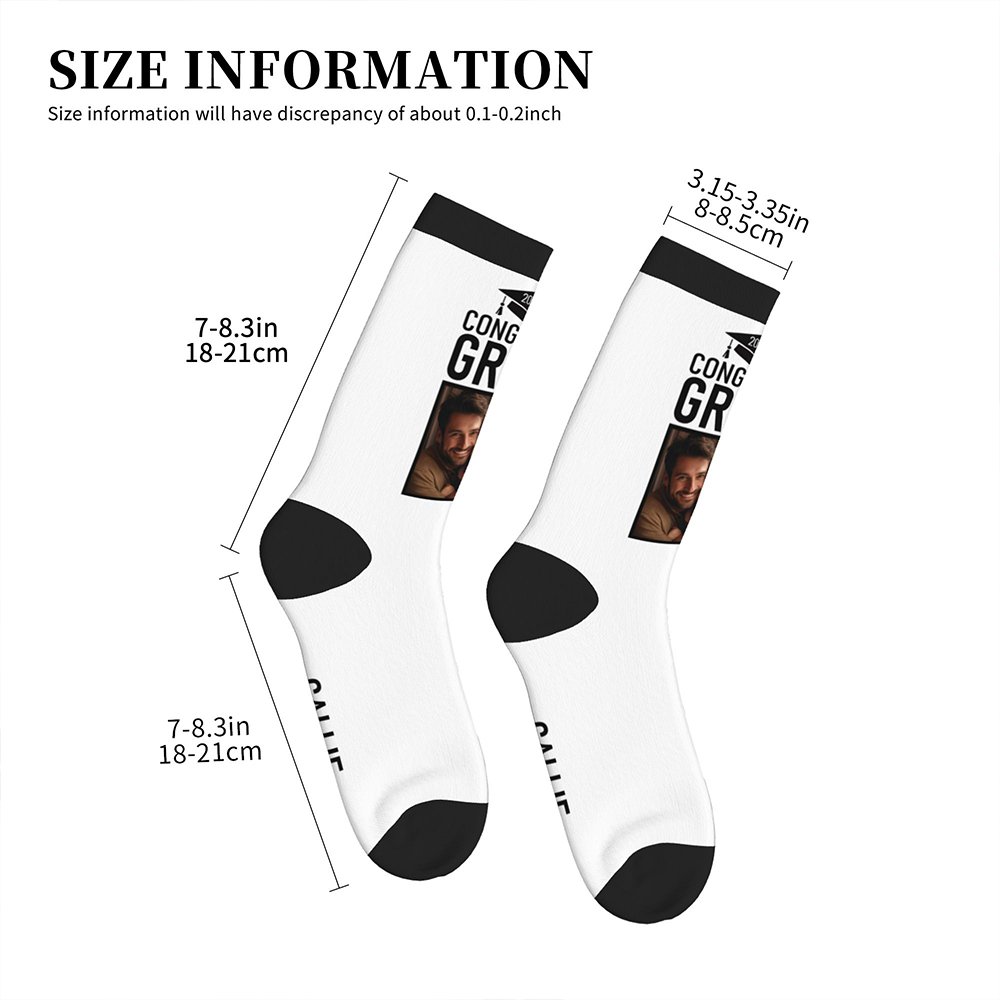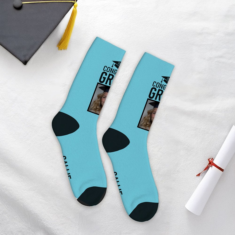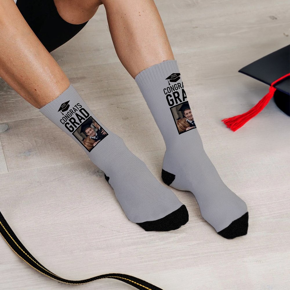 Med klara färger, roliga och festliga studentmössor och foton samt sloganen "Congrats Grad" är de här strumporna perfekta för att hylla studenterna. Varje par strumpor kan tryckas med den nyutexaminerades namn på sulan för att ge dem personlighet och humor.