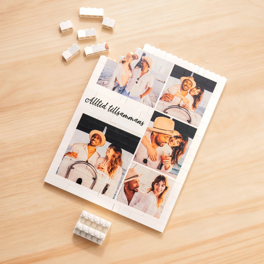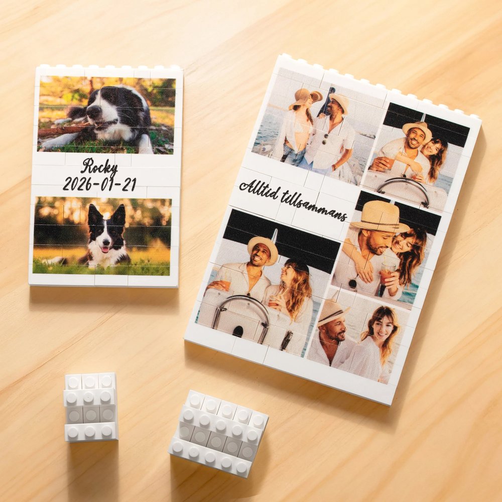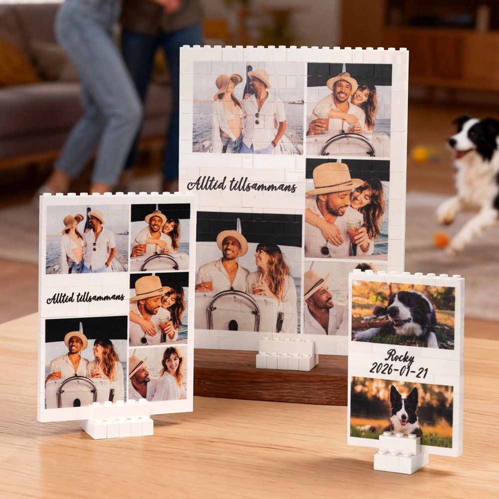 Detta charmiga byggstenspussel har ett dekorativt hjärtmönster och kan hålla 1 till 5 foton. Texten på pusslet kan anpassas och trycks direkt på bitarna, vilket ger en personlig touch som vackert fångar kärlekens och familjens essens. Denna unika design gör det till en iögonfallande detalj i vilket rum som helst.