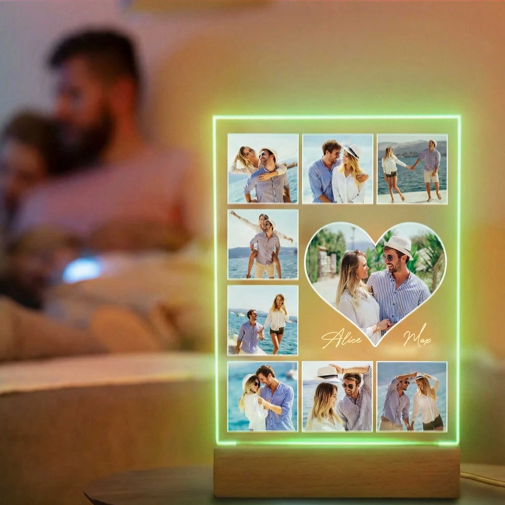Denna nattlampa låter dig lägga till 5-9 bilder på dig och din partner, tillsammans med era namn, för att skapa ett unikt och känslomässigt minne. Det genomskinliga akrylmaterialet och det mjuka ljuset gör denna lampa till en romantisk symbol för er kärlek.