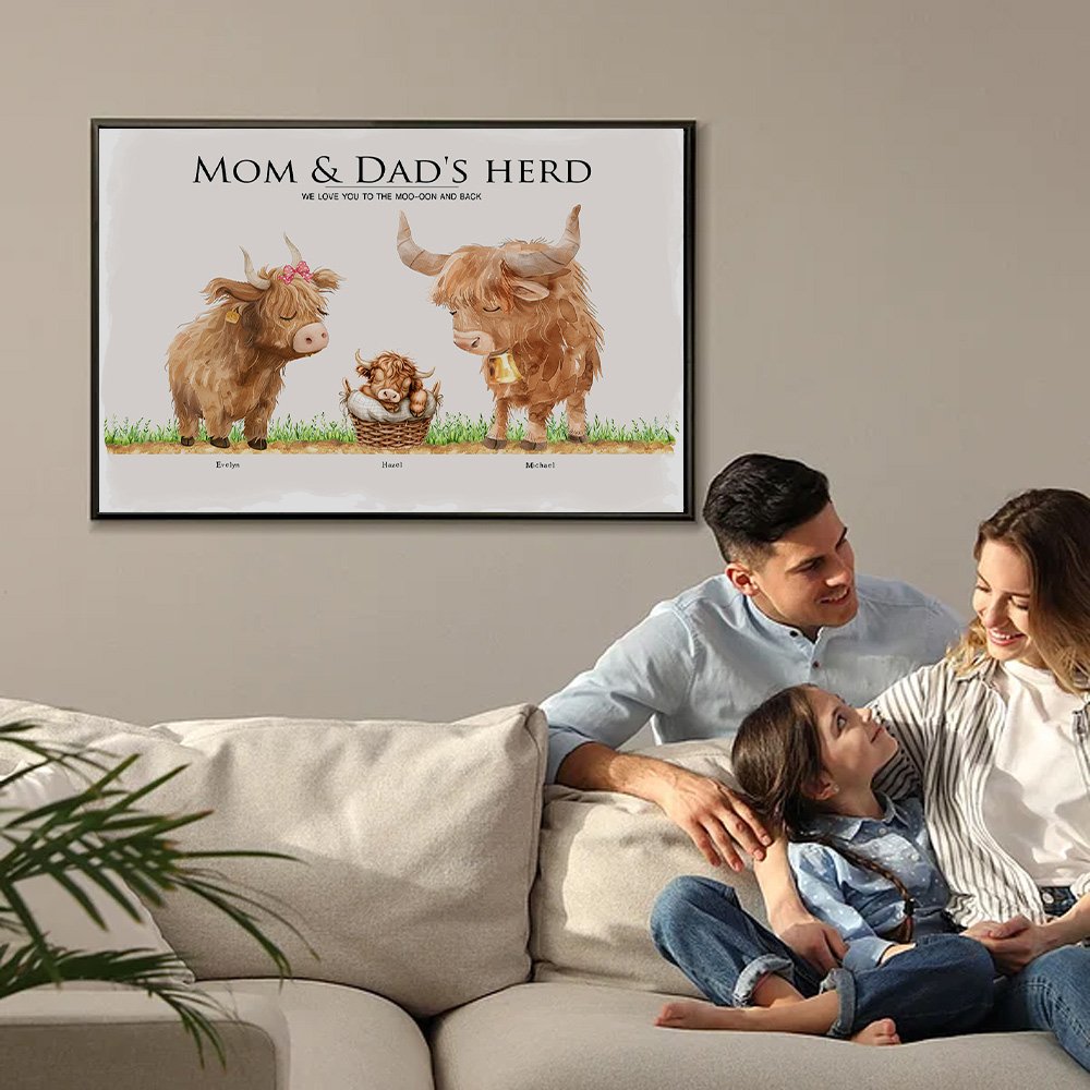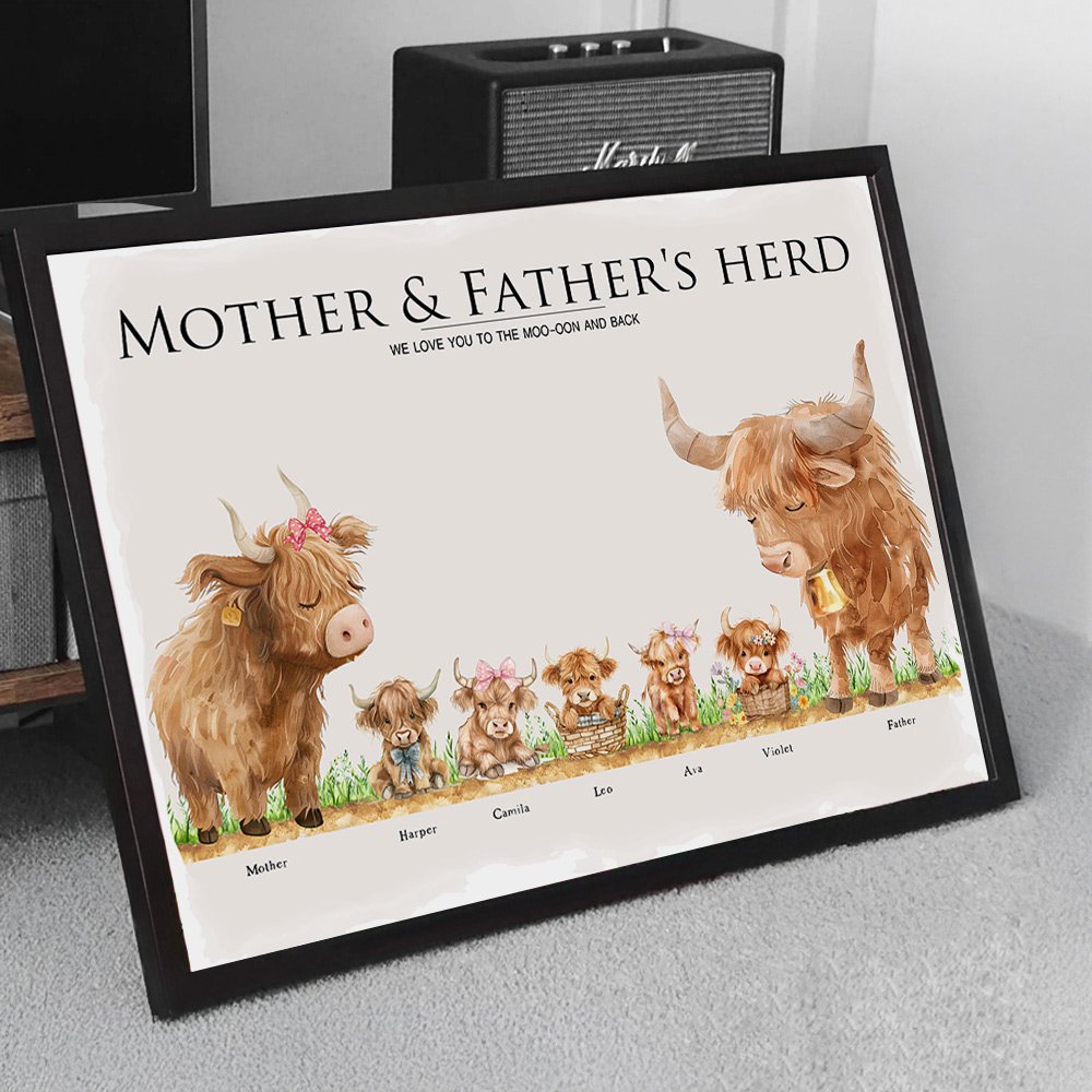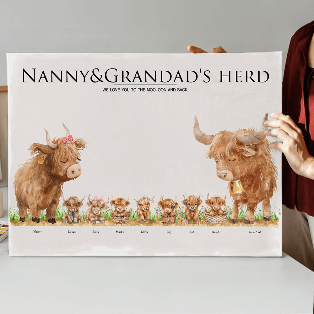 Denna målning sticker ut med en bedårande tecknad Highland-kofamilj, där varje medlem är återgiven med verklighetstrogen charm och hjärtvärmande tilltal. Den kan också anpassas med upp till 15 kalvar i olika poser, som alla bär ett unikt namn för att representera familjemedlemmar, vilket ger en personlig touch till verket.