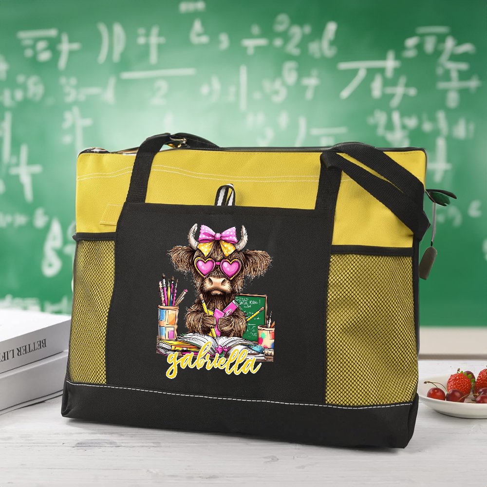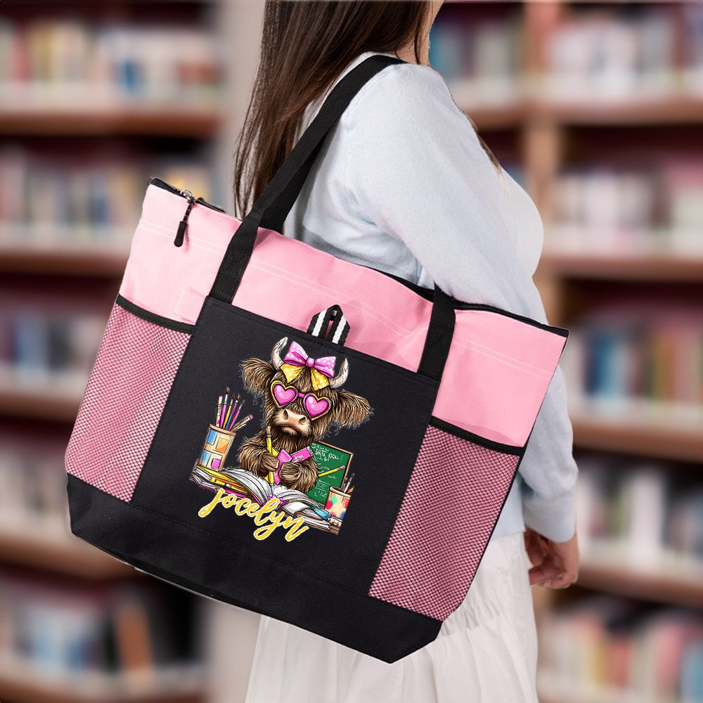 Personlig Highland Cow Mesh-fickor Oxford Tote Bag med namn och dragkedja Tillbaka till skolan Examen Lärarens dag Present för akademiker Lärare
