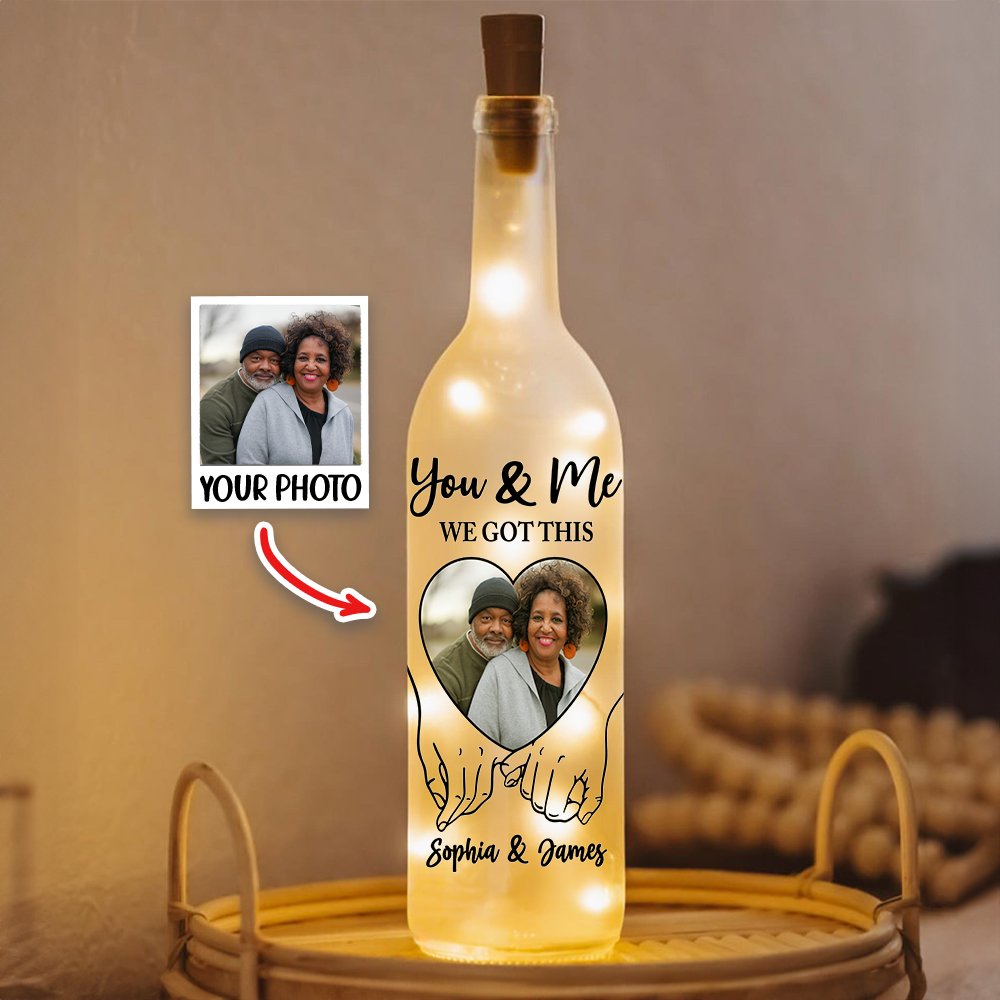 Denna charmiga flasklampa med handhållningsmönster kan anpassas med ditt favoritfoto, namn och ett val av ett romantiskt citat, vilket gör den till en verkligt unik gåva. Den anpassade designen fångar speciella ögonblick, perfekt för par som firar kärleken.