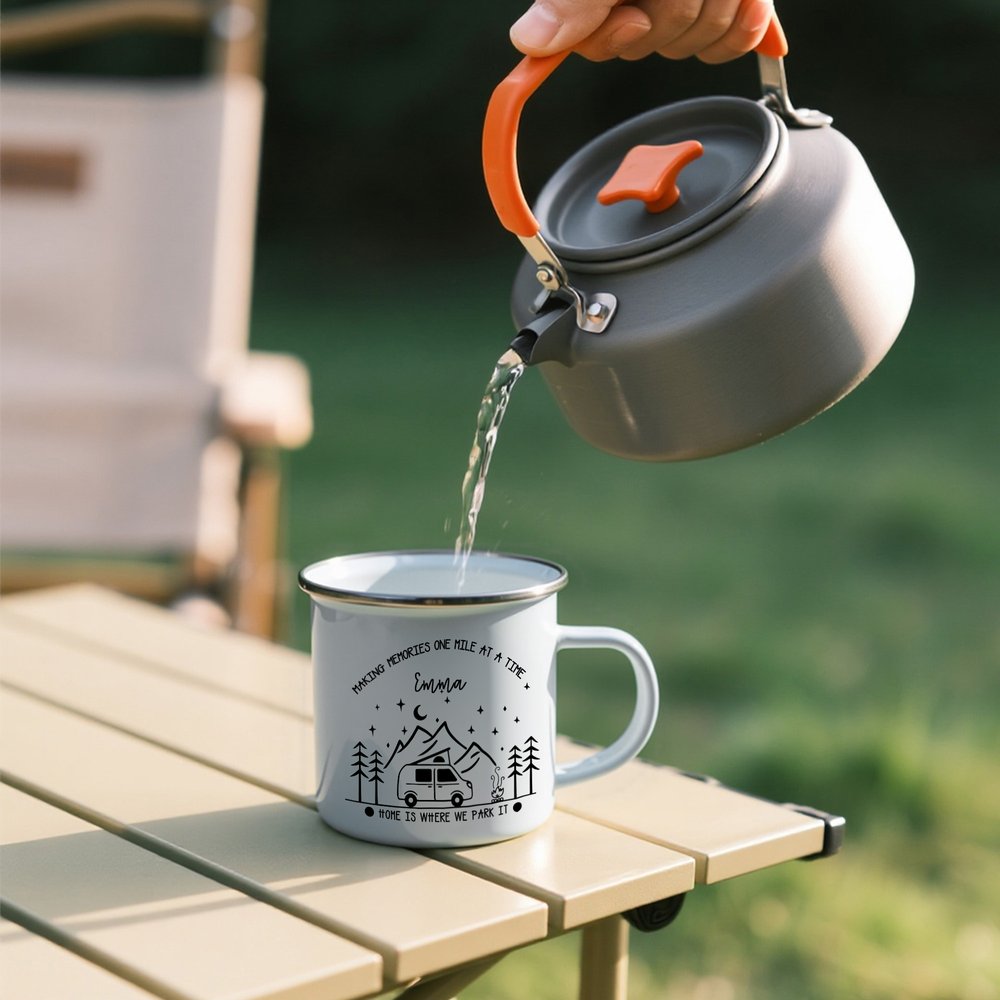 Den här emaljerade muggen är designad för par som älskar camping, husbilsresor och utomhusäventyr och blir en varm minnessak som påminner om gemensamma upptäcktsfärder och en anda av frihet. Oavsett om det är en semestergåva, årsdagspresent eller en personlig behandling för dina resor, bär den dina innerliga känslor.