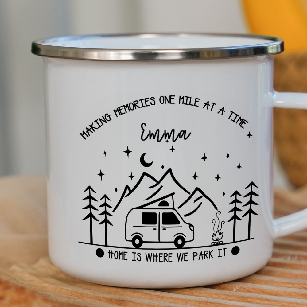 Denna emaljmugg hämtar inspiration från utomhuselement som husbilar, stjärnhimlar, lägereldar och bergsskogar, med lekfull text som "Home Is Where We Park It" tryckt på ytan. Du kan också göra den personlig med ett namn och skapa ett dricksglas som är helt ditt eget.